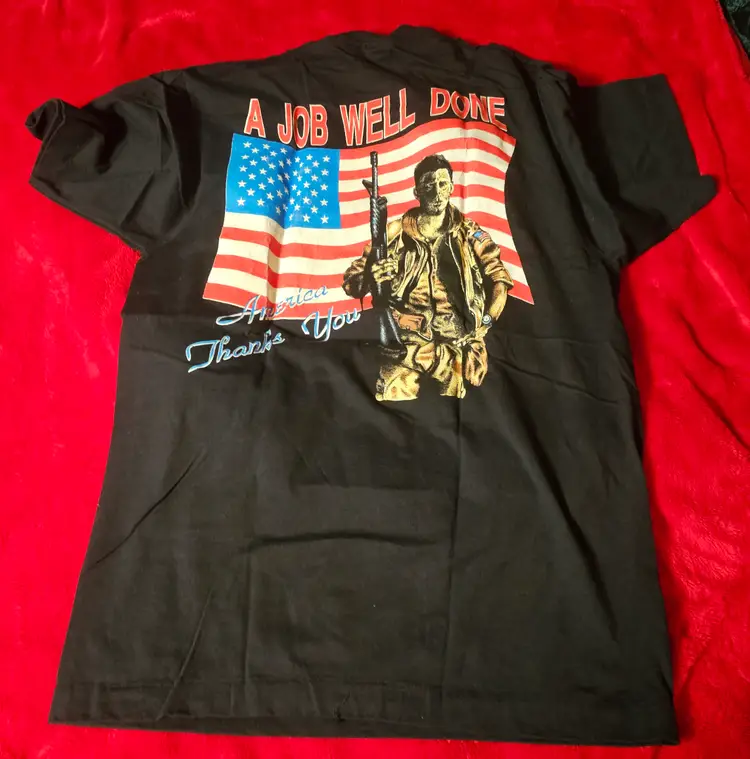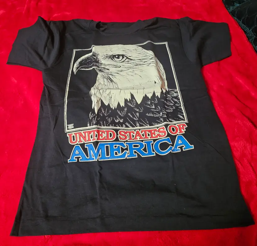 This Vintage Eagle T-Shirt for adults in black features a solid pattern with a crew neck and short sleeves. The shirt is in size L and has a regular fit, making it comfortable for everyday wear. The design includes imagery of nature and animals, with a 90s theme, perfect for those who appreciate outdoor and wildlife motifs. Made in the United States by Screen Stars, this vintage shirt is a unique addition to any wardrobe for those who enjoy a touch of retro style.