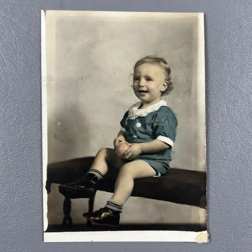 Vintage Early 1900s Studio Portrait Photo Child Sitting On A Bench With Toy Color-Tinted Blue Shirt Buttons Lace Collar Black Shoes. Photo is 3.5x5"