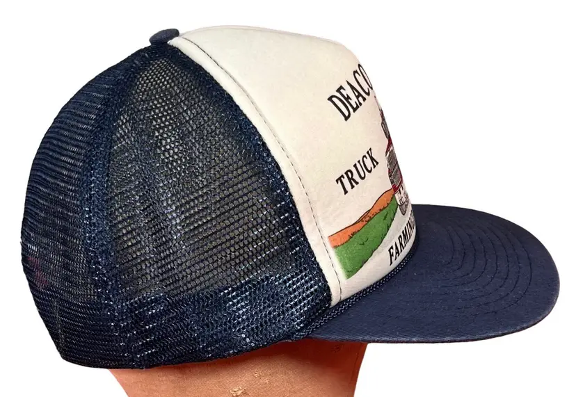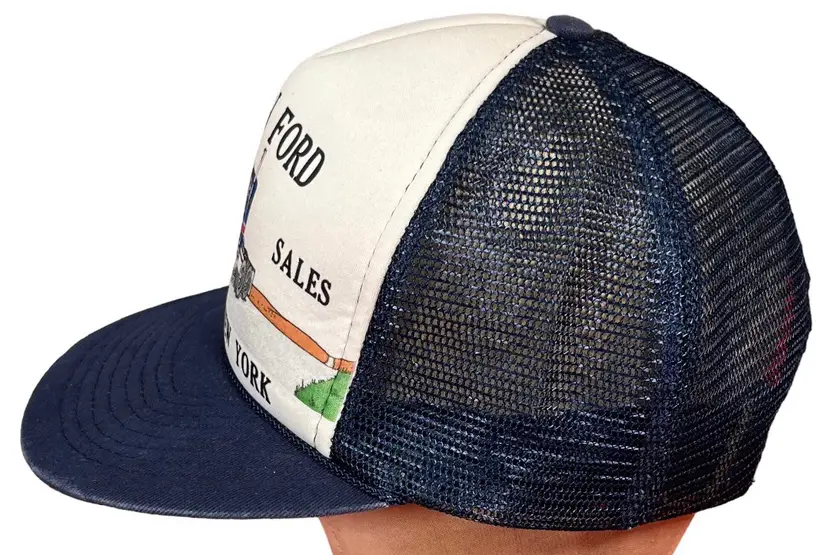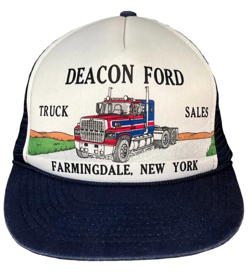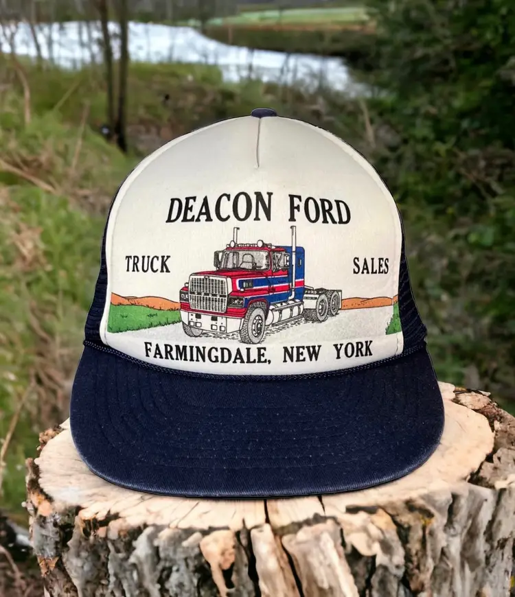 Vintage Early 1980's Deacon Ford Truck Sales Farmingdale New York Snapback Trucker Style Cap Hat. The cap is in overall very nice condition with very light wear.