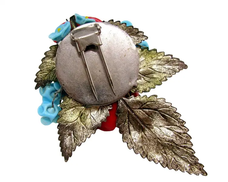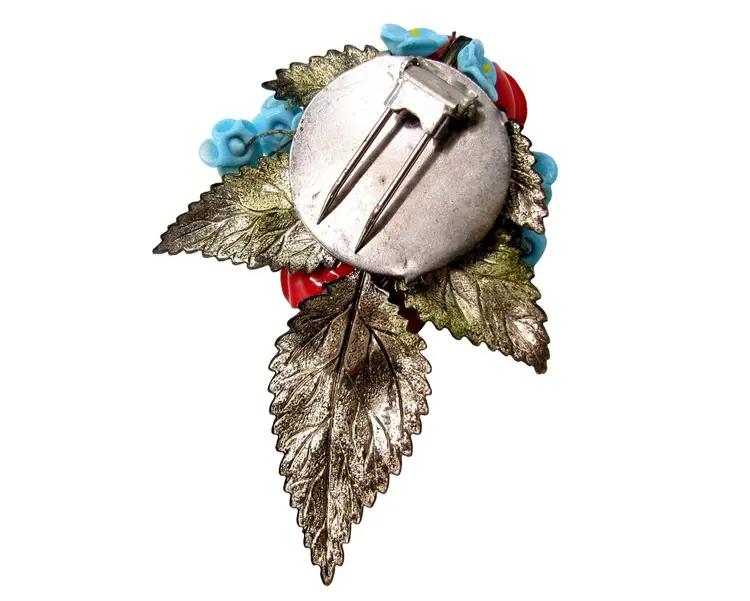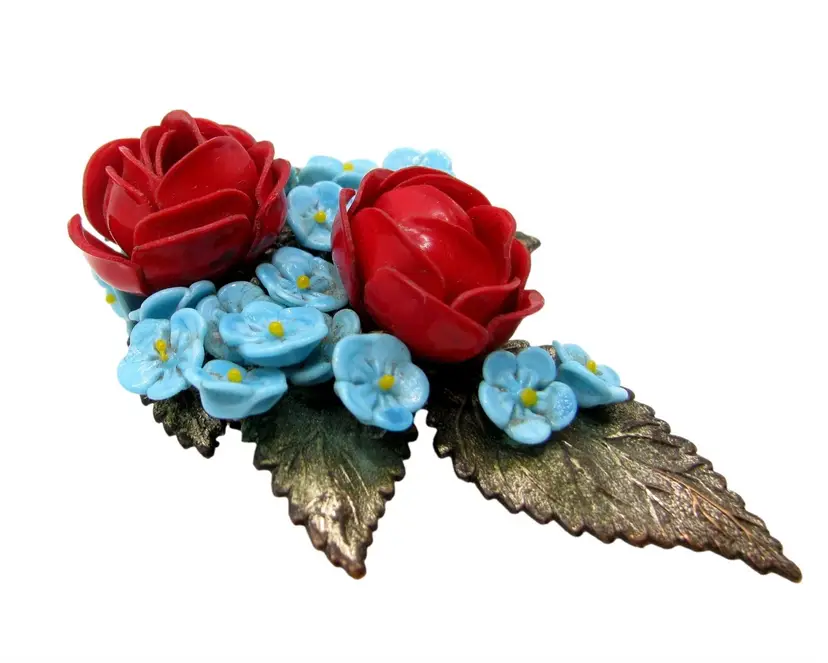 This wonderful dress clip is early Miriam Haskell and features a dress/fur clip design feauring red plastic rose and small glass forget-me-not flowers along with silver tone leaves.