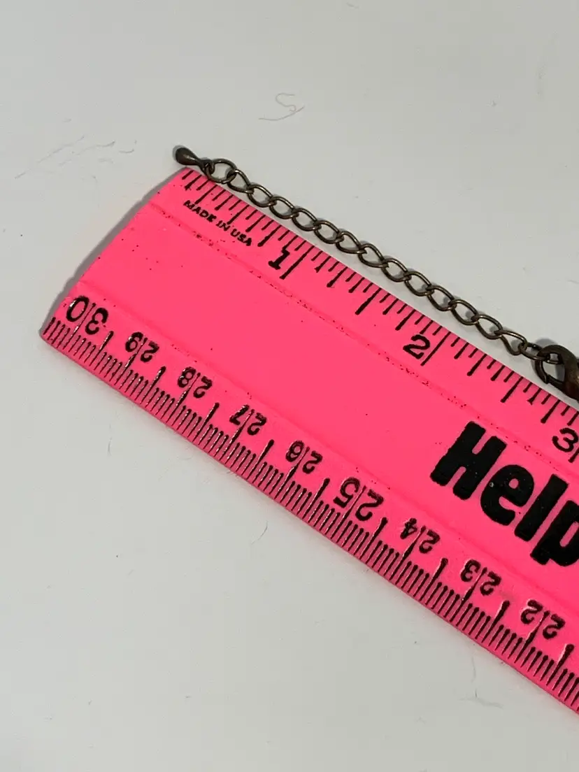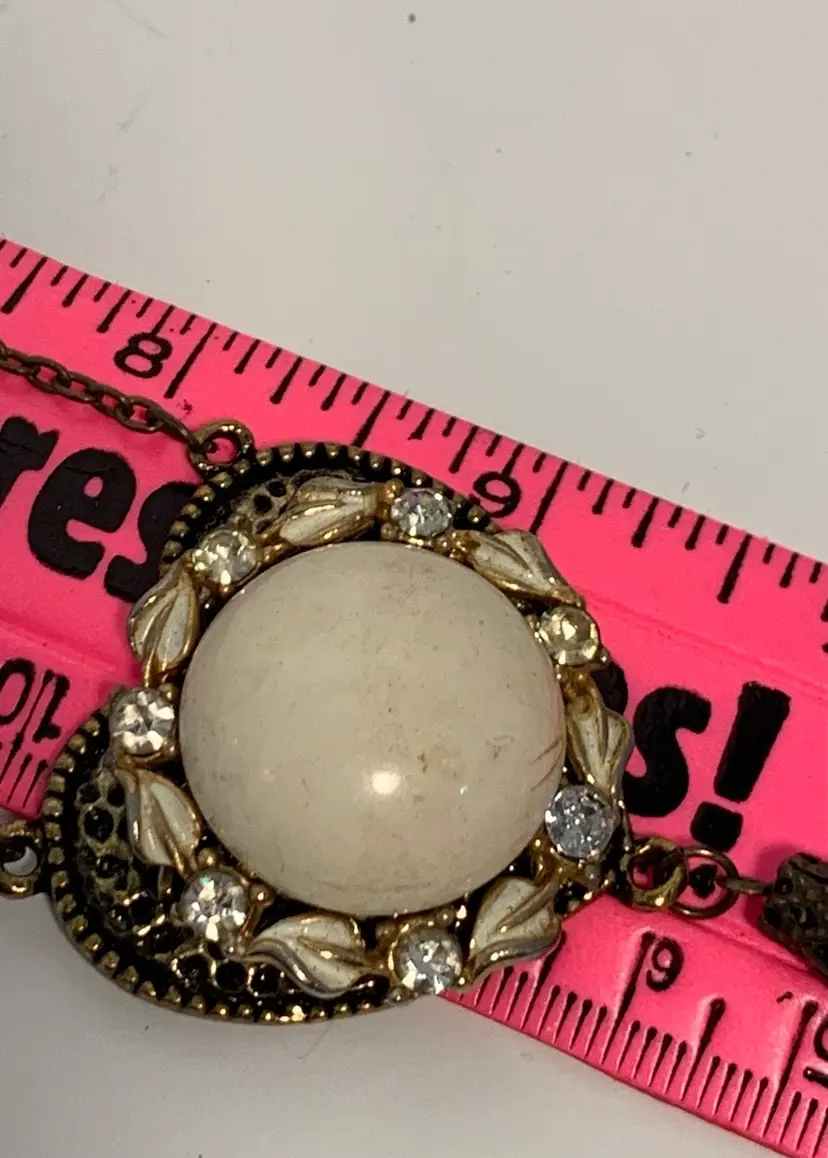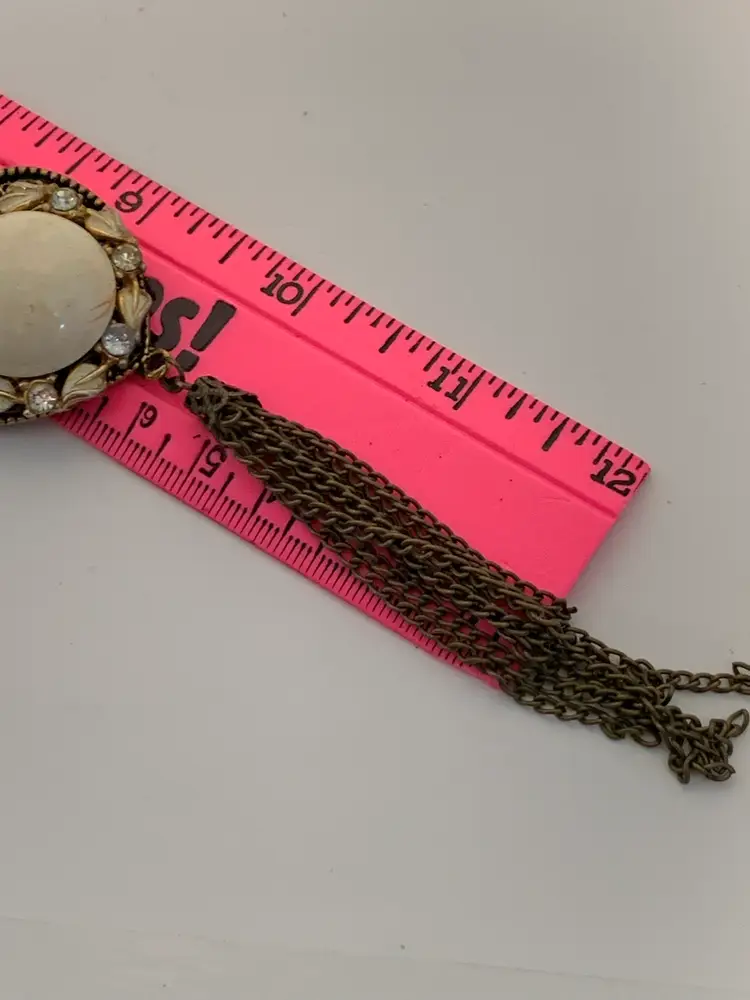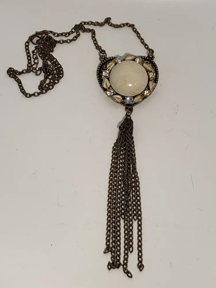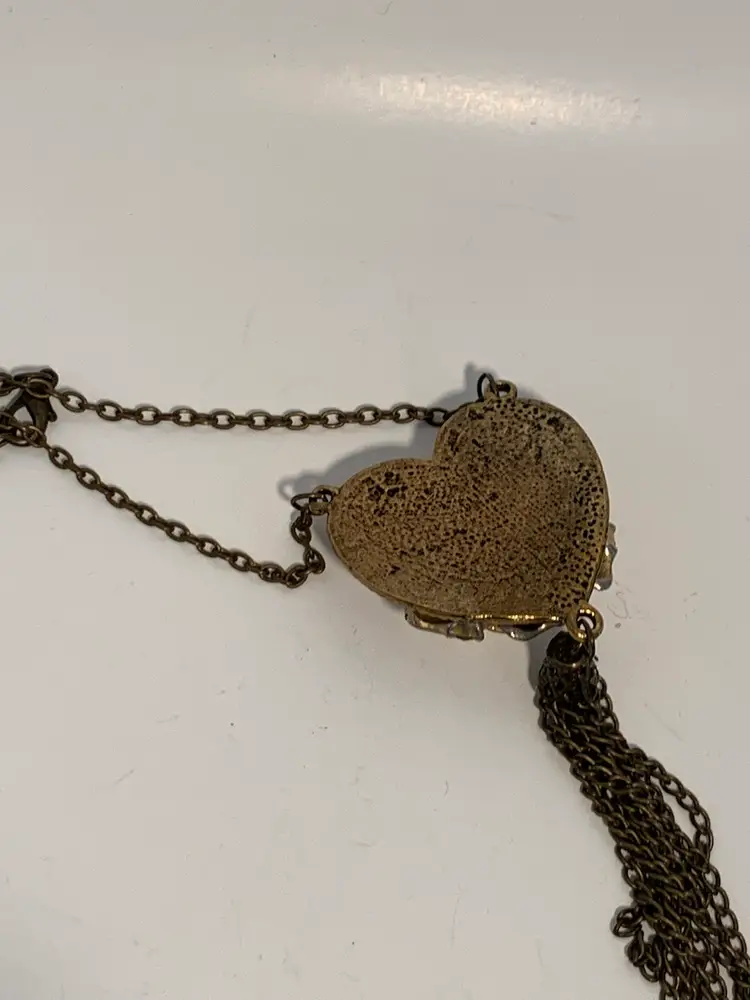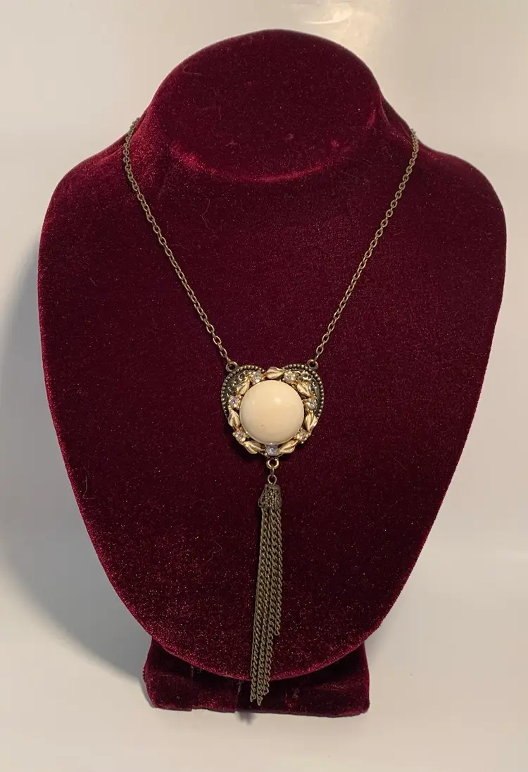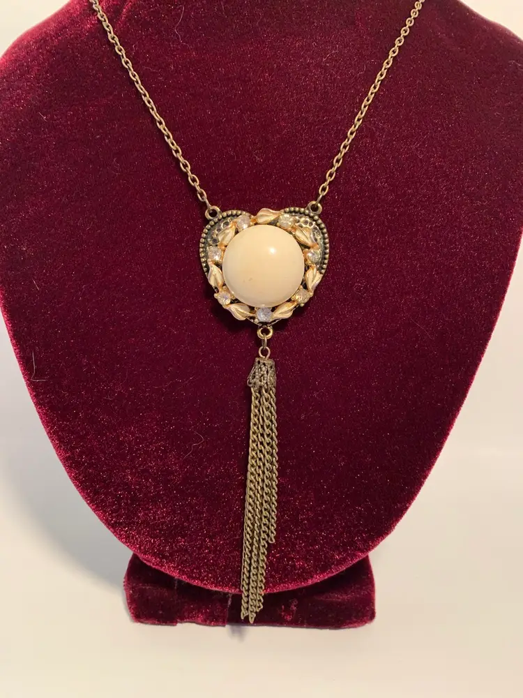 Vintage mid century clip on earring mounted on a tasseled heart shaped antique finish necklace. Necklace is 8” in wearable length and around 13” including tassel and has a 2 1/2” extension and is new. Vintage earring has some patina due to age, but is part of the charm of this piece!