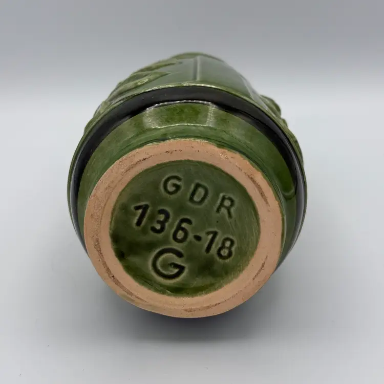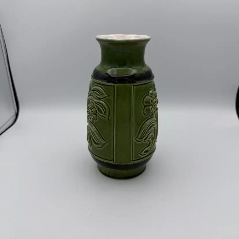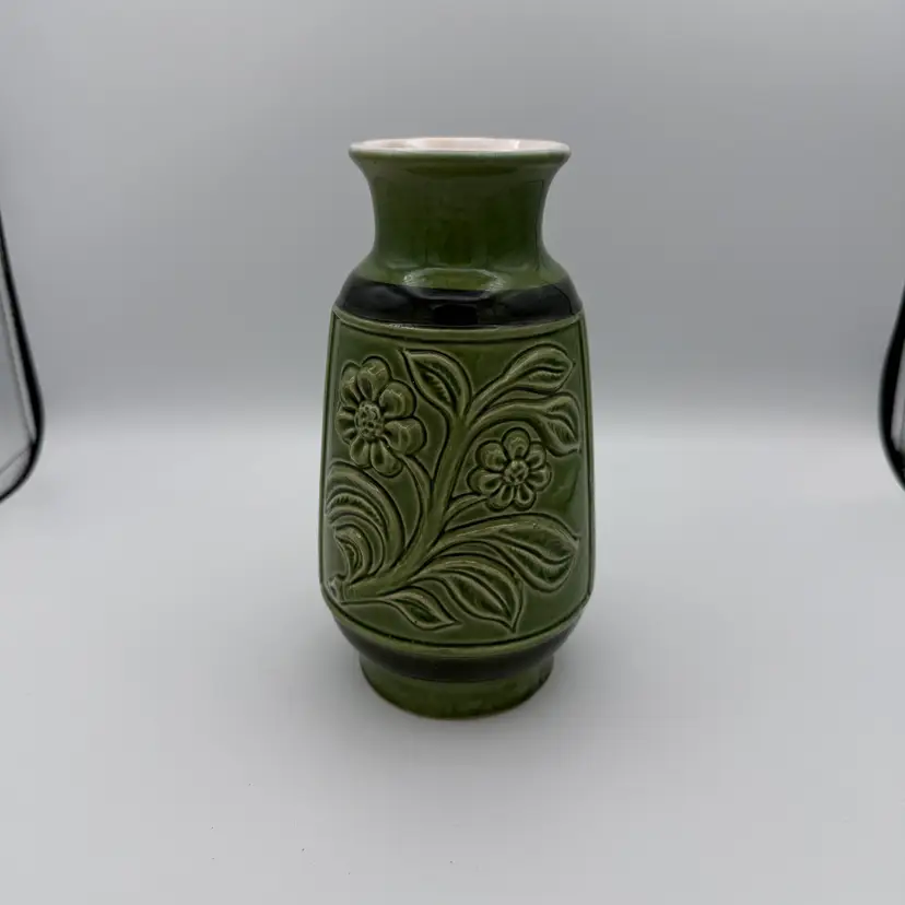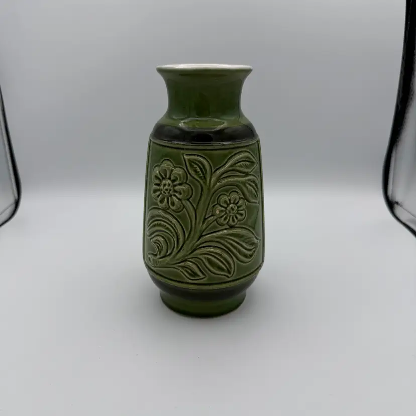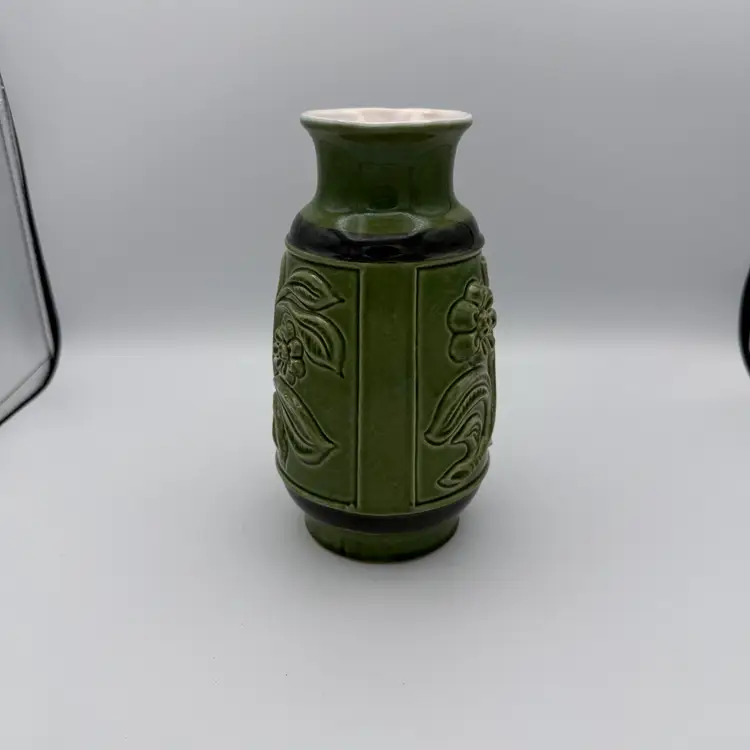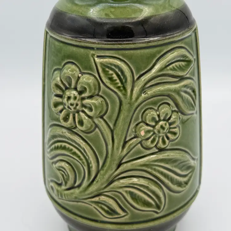 Vintage East German Ceramic Vase. Featuring olive green glaze and a raised floral design from the 1970's. One of the flowers has a small chip on the glaze (pictured). 7 1/2" Tall