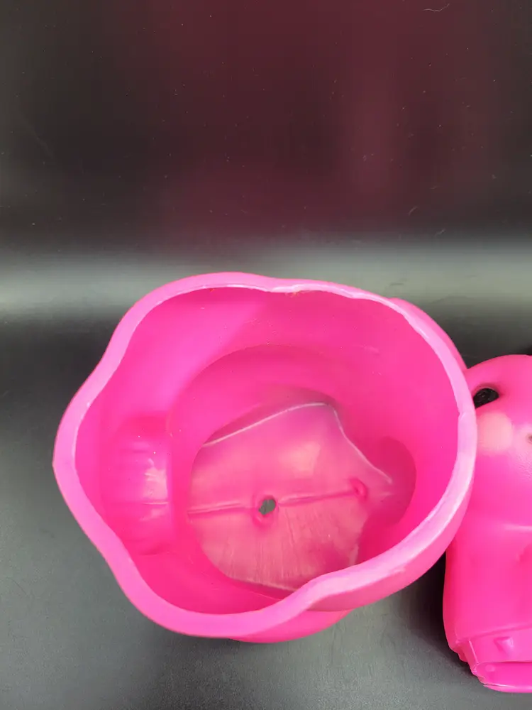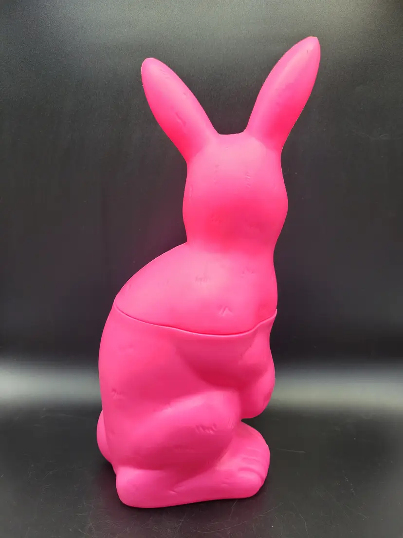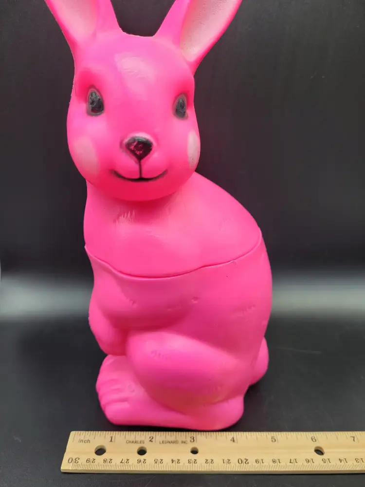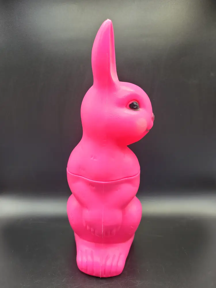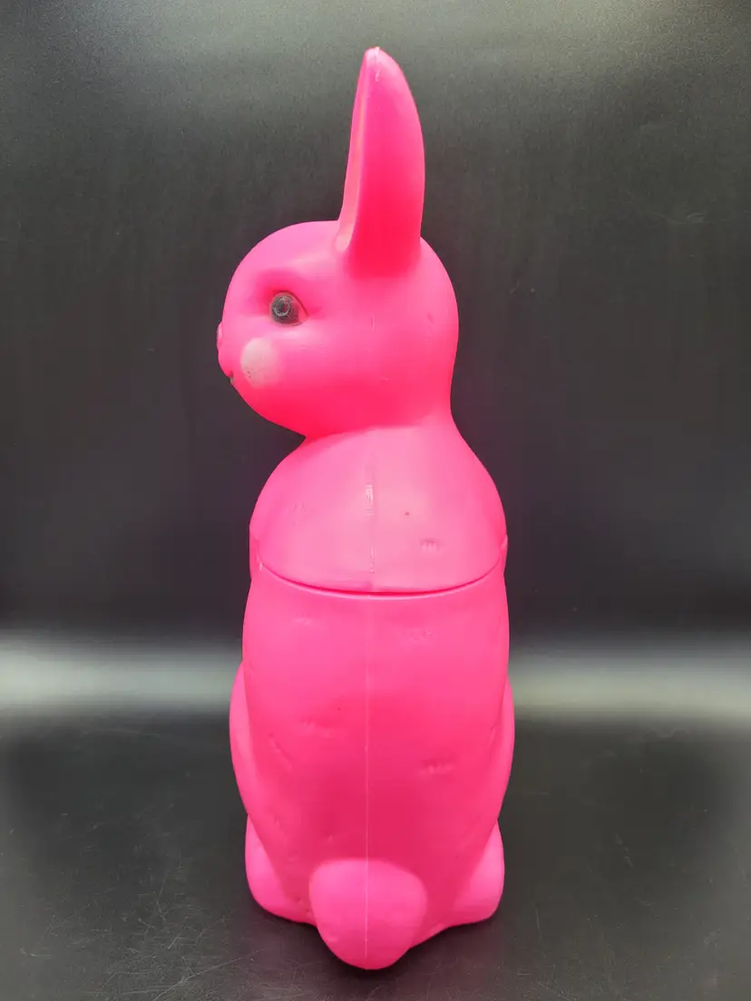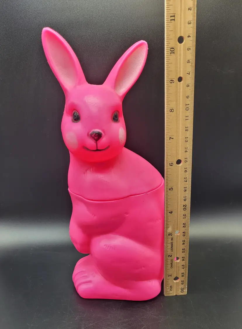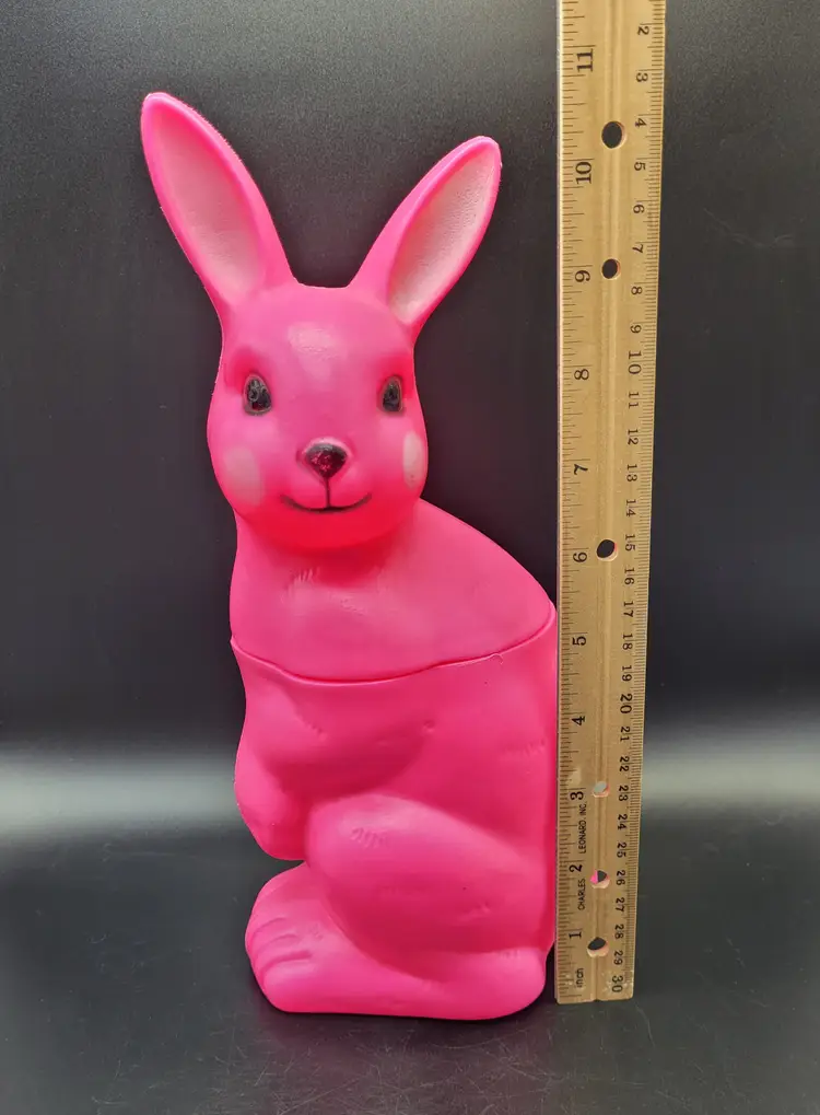 The Vintage Easter Bunny Hot Pink Blow Mold Plastic Candy Container is a unique and whimsical addition to your Easter decor collection. The vibrant hot pink color adds a fun and playful touch to the Easter season, while the plastic material ensures durability and longevity. This charming candy container is perfect for storing treats or displaying as a decorative piece during the Easter holiday.