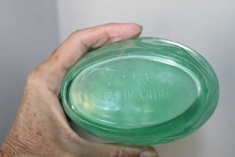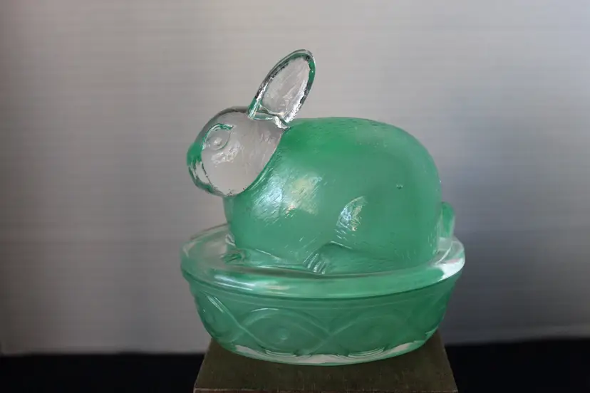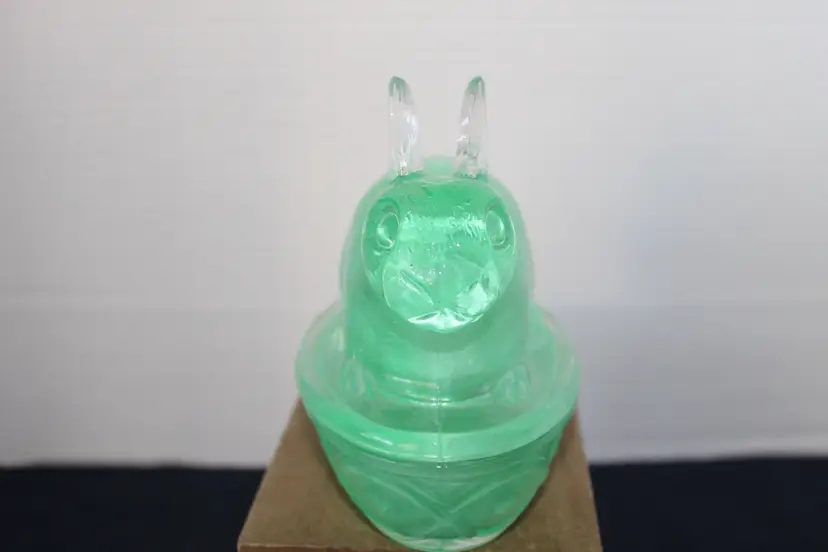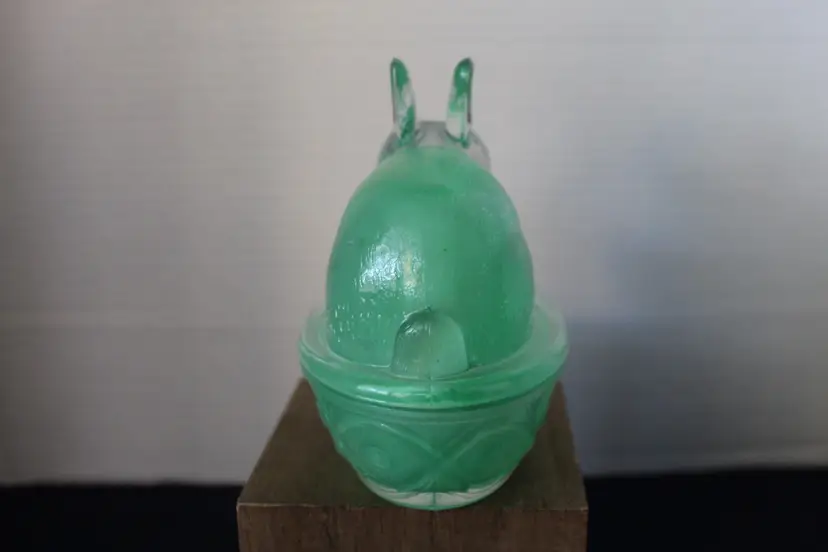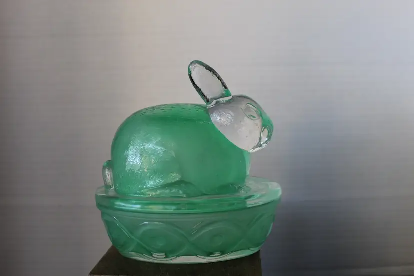 This vintage Easter Bunny/Rabbit on Nest candy dish is a charming addition to any spring-themed collection. The green frosted glass material gives it a unique and festive look, perfect for decorating your table during the holiday season. The 5" by 5" size makes it a versatile piece that can hold candies or other small items while adding a touch of whimsy to your home decor. Says GAC 2001 on the bottom. Made in China.