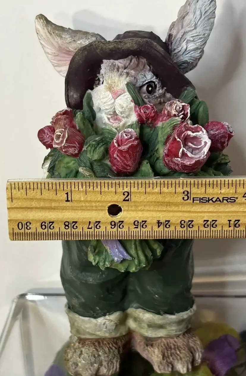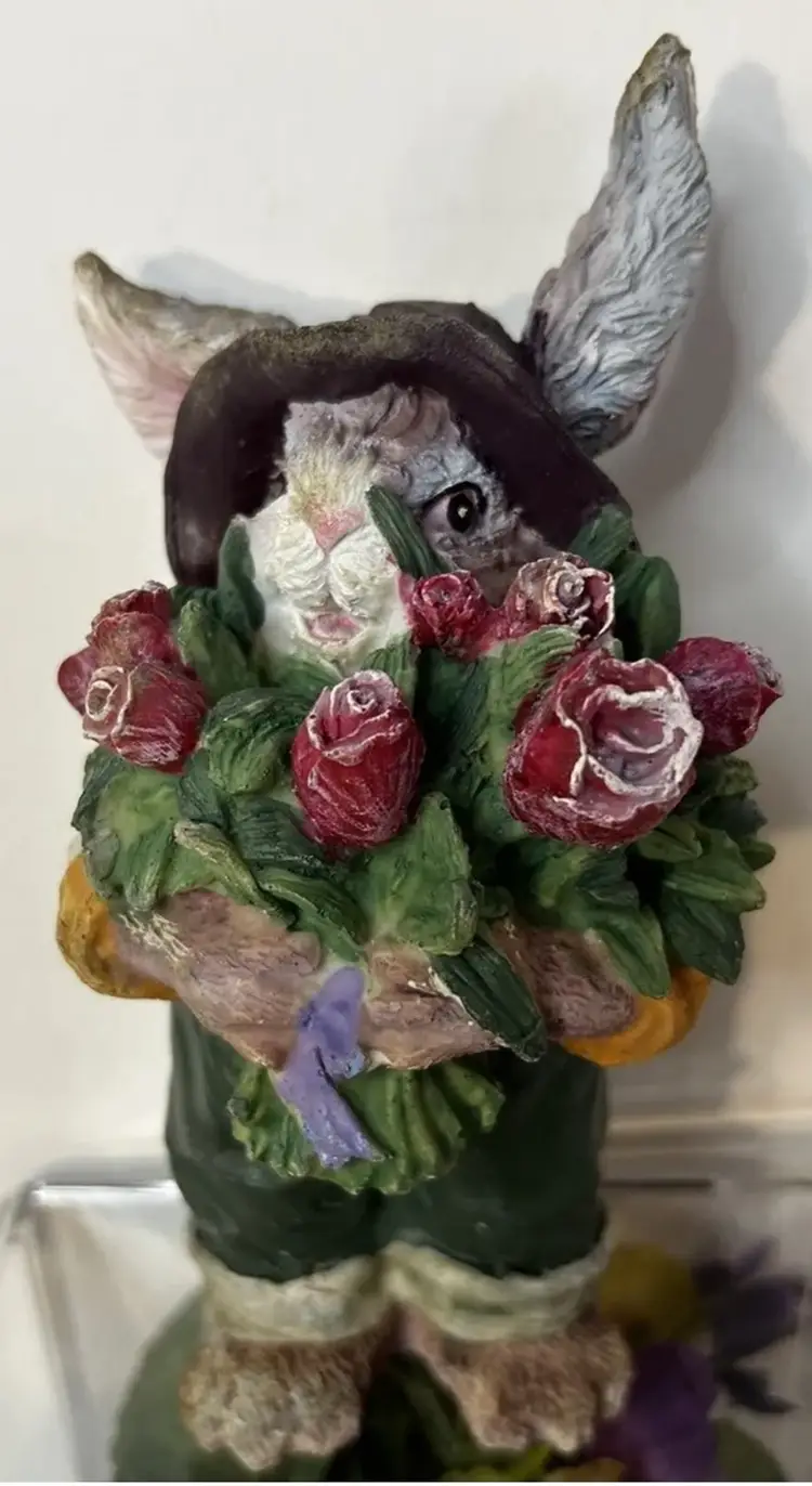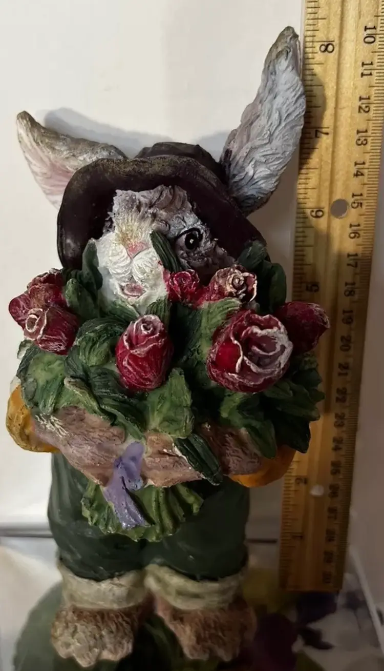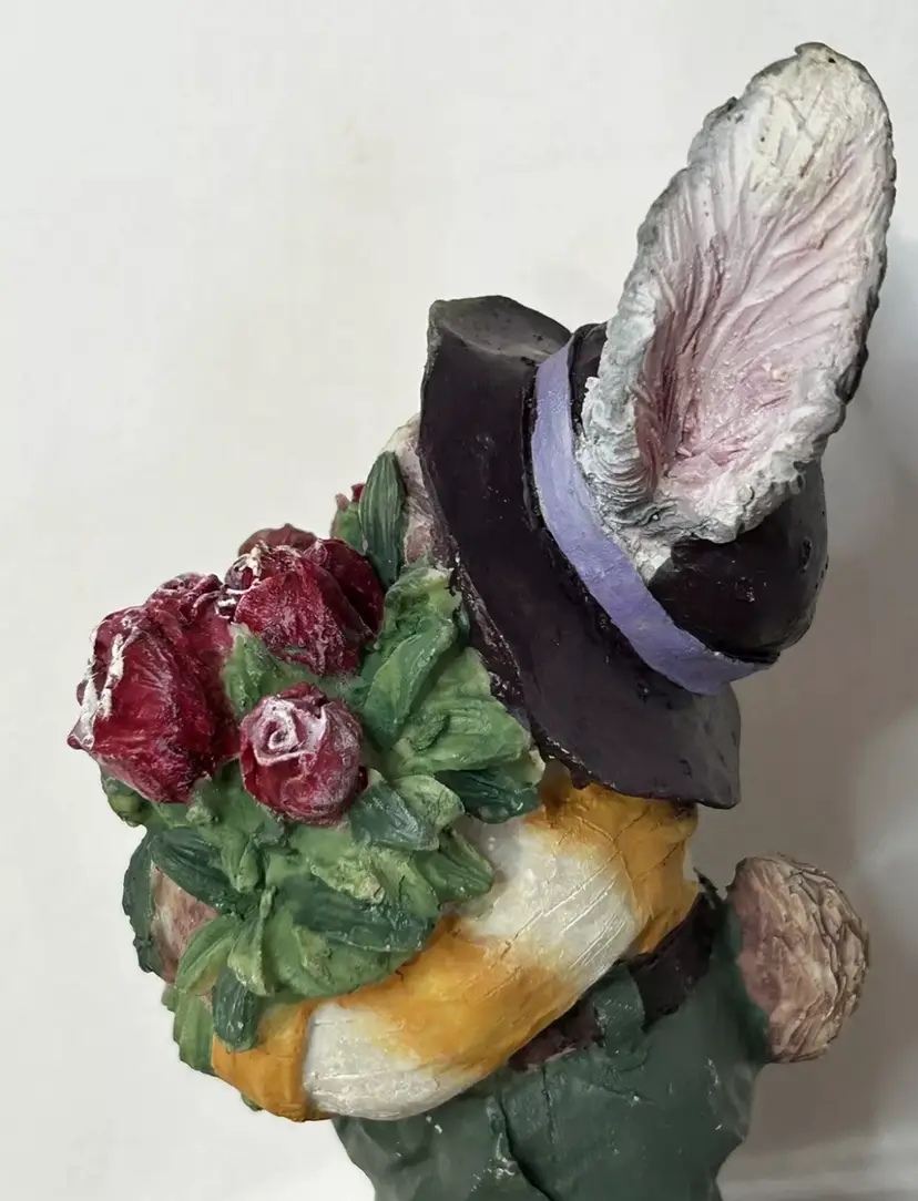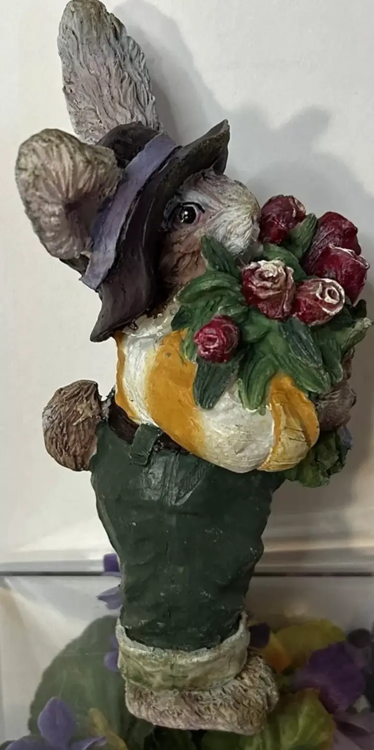 This vintage brown bunny sporting overalls and a hat holding a wonderful bouquet of red roses stands 8.5" tall and is made of durable resin. This adorable brown bunny is ready to work either in your home or garden to add whimsical charm to your Spring or Easter decor. The intricate details and craftsmanship of this piece is sure to impress any bunny lovers. Crafted with high quality resin, this figurine is not only durable but also beautifully designed. Vintage Brown Bunny In Overalls & Hat w-Bouquet Roses 8.5" Tall Resin Figurine is in excellent vintage preowned condition, with NO chips, cracks or repairs. Please review all pictures for proper assessment of its vintage preowned condition.