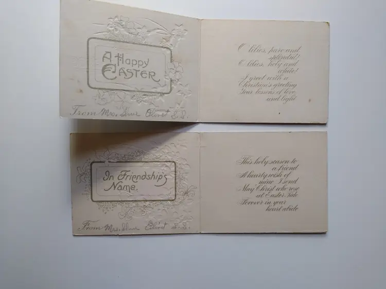 This charming lot features four vintage Easter postcards, perfect for collectors of holiday ephemera. The set includes two standard-sized postcards and two smaller folded cards. The standard postcards depict delightful scenes: one with two children dressed in Easter attire and another with a row of fluffy yellow chicks. Both are marked 'MADE IN U.S.A.' and have 'Miriam Grammes' handwritten on the back. The two smaller, folded cards feature embossed designs with 'A Happy Easter' and 'In Friendship's Name' on the front, opening to reveal religious greetings. Both folded cards have 'From Mrs. Sue Olint S.S.' handwritten on the front. These cards capture the nostalgic spirit of early 20th-century Easter celebrations, showcasing both secular and religious themes.