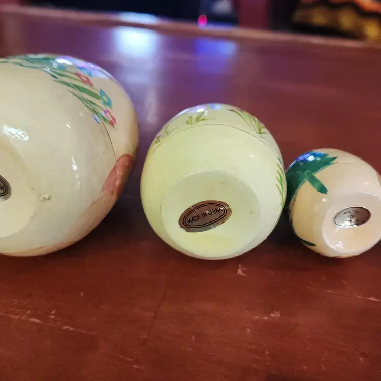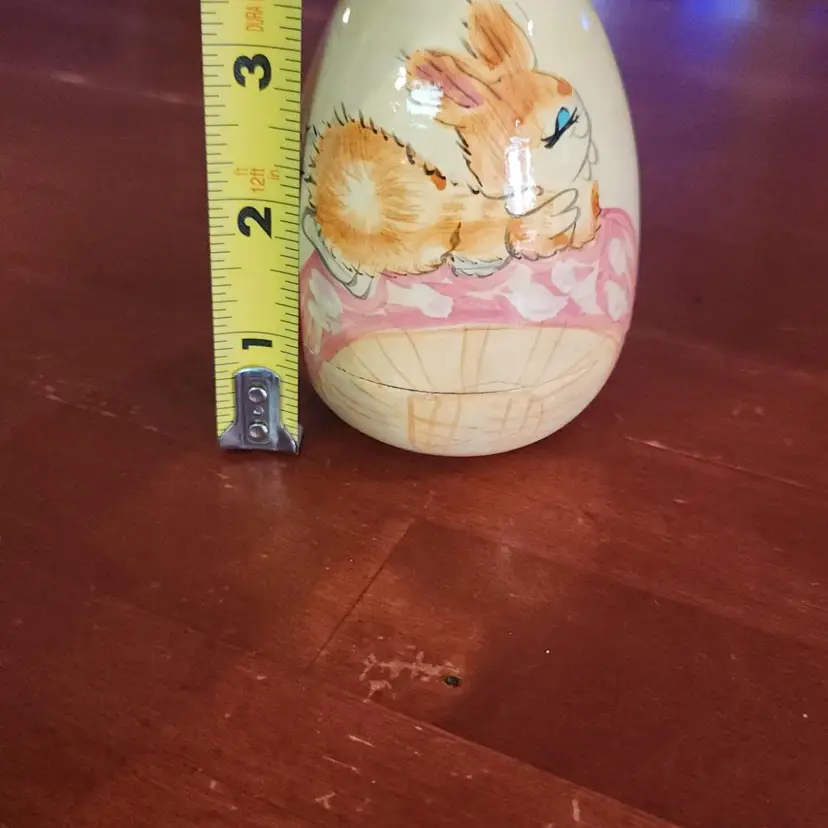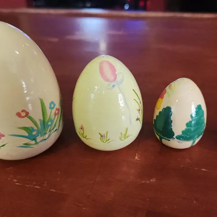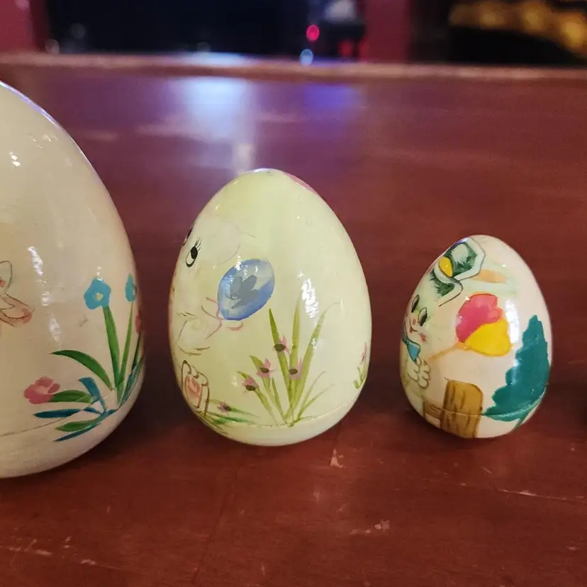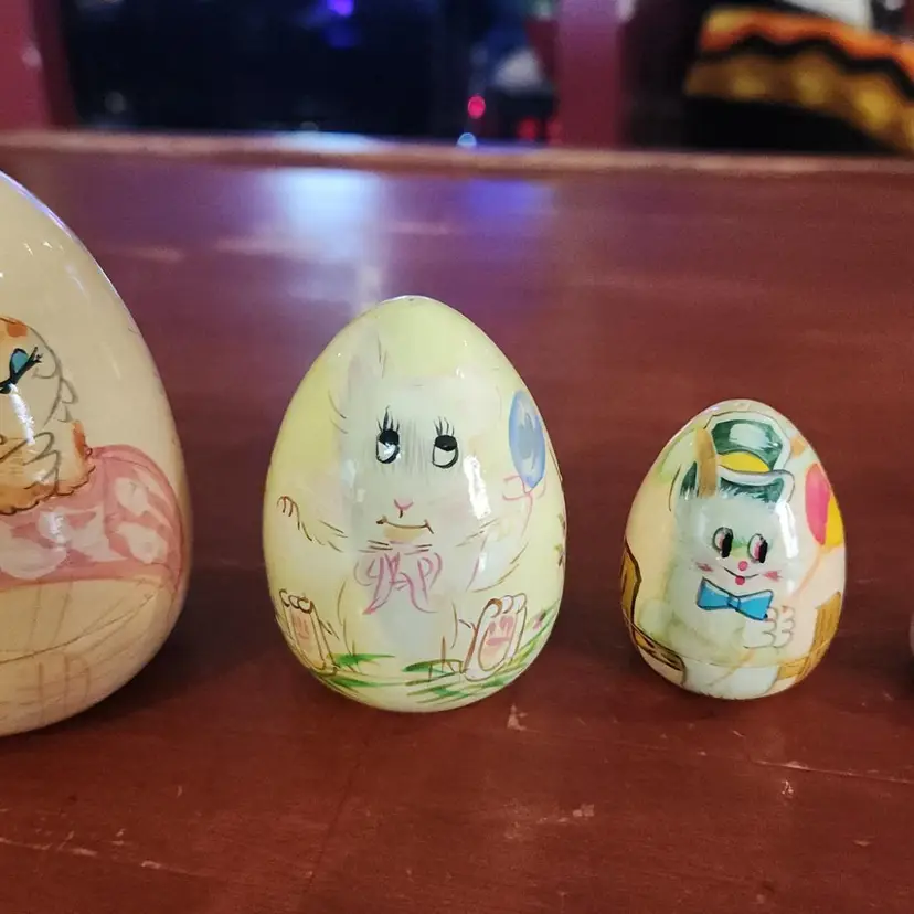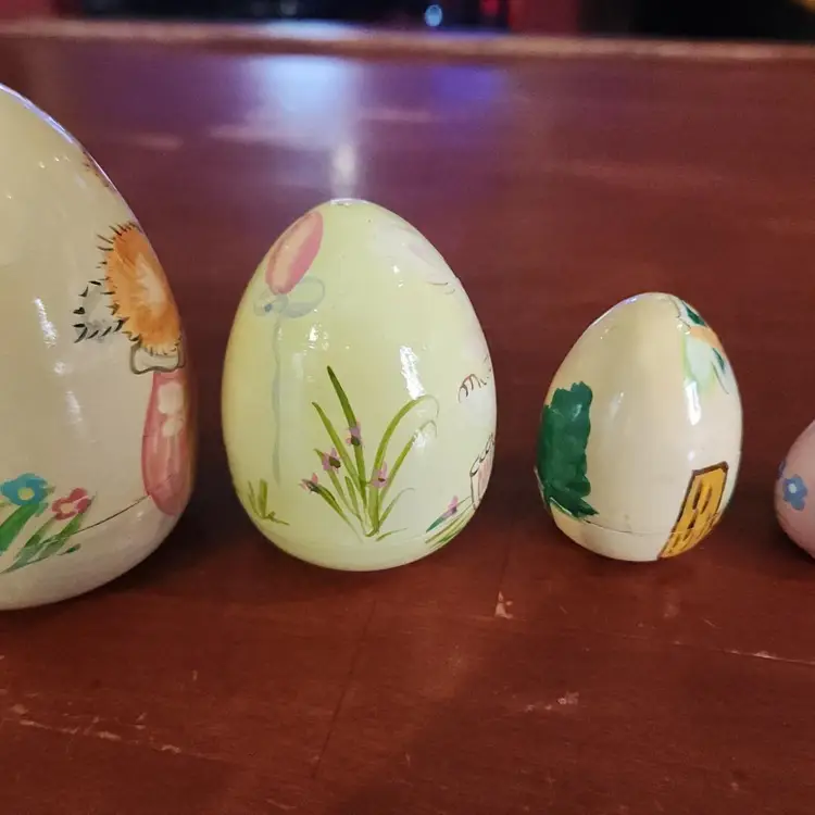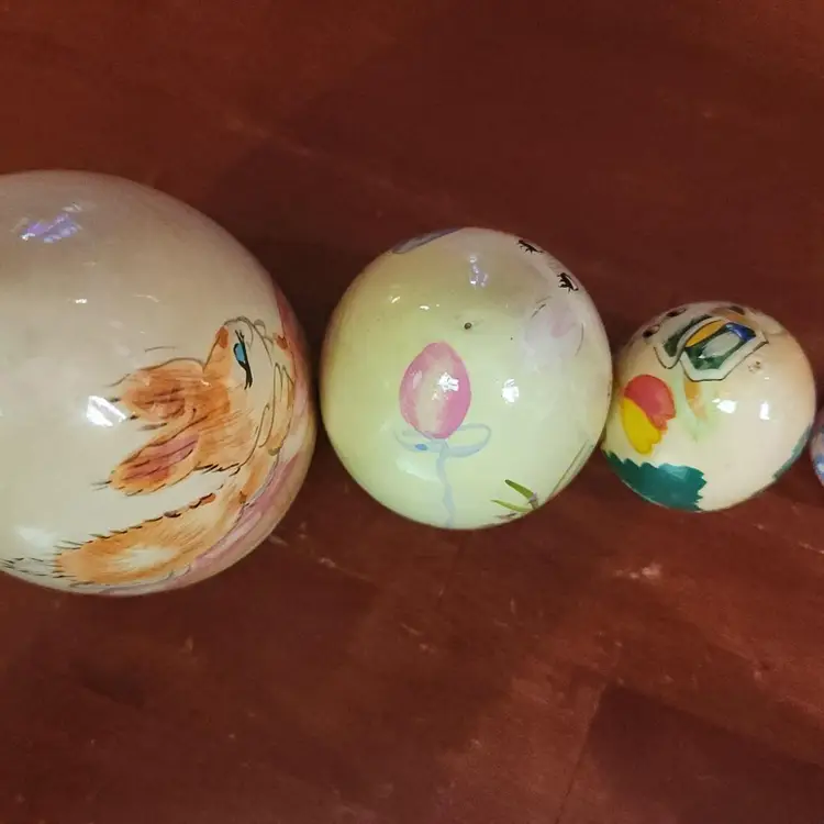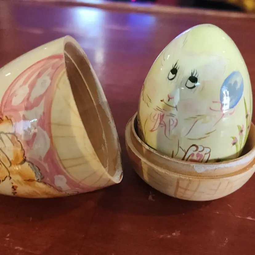 Set of 4 eggs 3 open made in China hand painted with cute Easter bunnies and flowers good shape