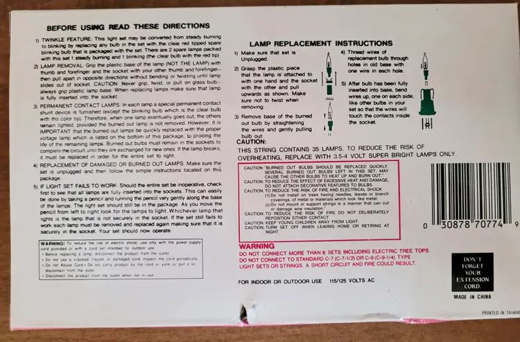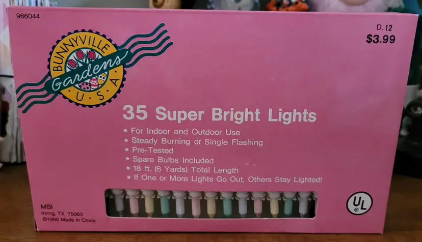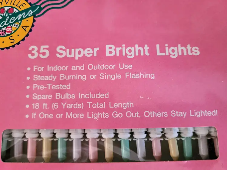 Michaels Stores Inc. Bunney Gardens U.S.A. Made in China. 18ft(6yd) cord. As Is: the lights work fine, it's the packing that has the damage. From a smoke free home, please refer to the pictures for its condition and size. Approx: 5x8.5x1