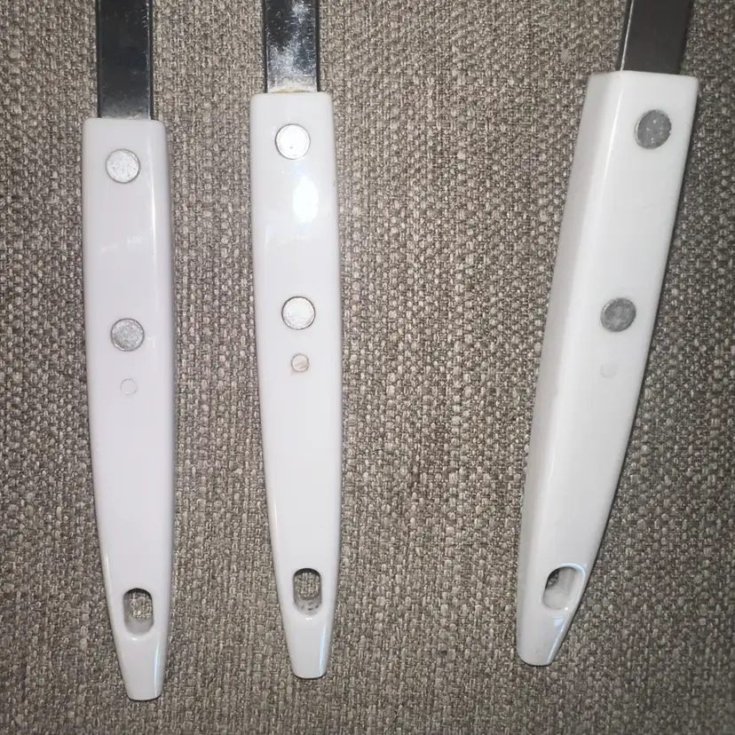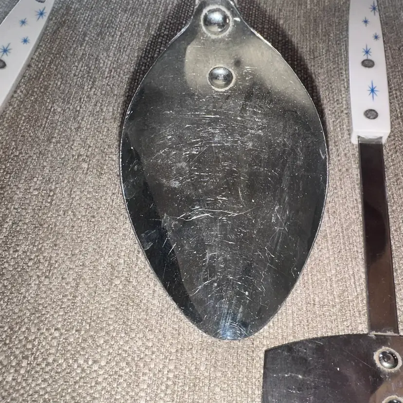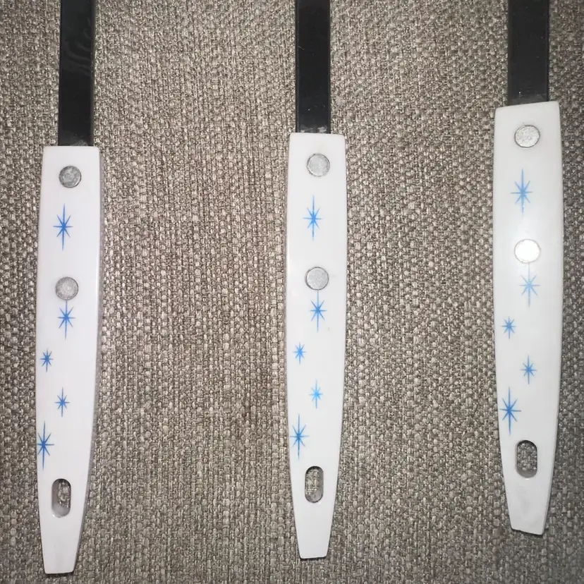 Excellent Vintage Condition Ecko Atomic Starburst White Blue Stainless Utensil Set Of 3. Made in USA. Set Includes 1 Spatula, 1 Serving Spoon and 1 Soup Ladle. Handles Are In Great Condition Free Of Cracks, Chips Or Repairs. Smoke Free Home. #vintageutensils #kitchenessentials #Ekco #vintage #retro #mcm #atomicstarburst