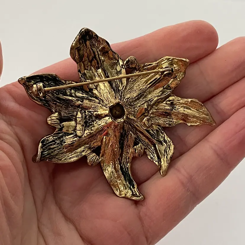 Vintage edelweiss flower brooch - enamel and green rhinestones