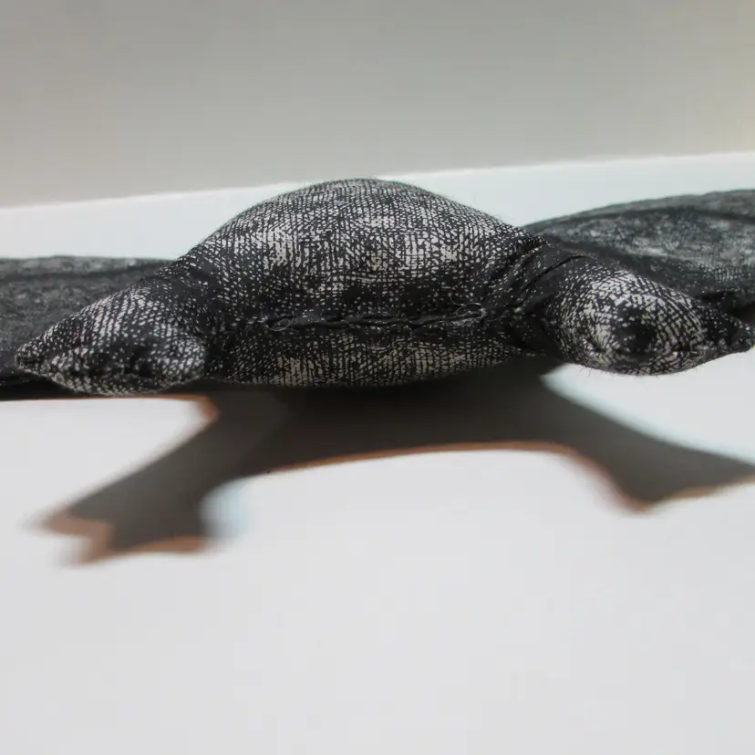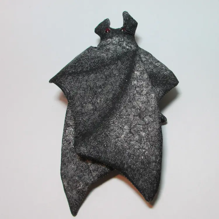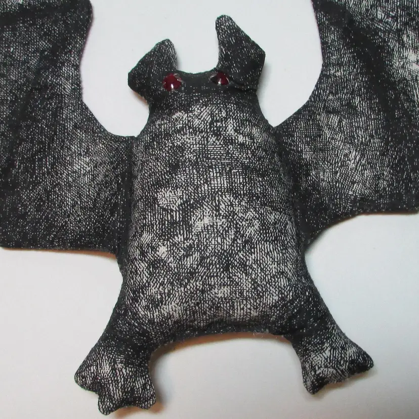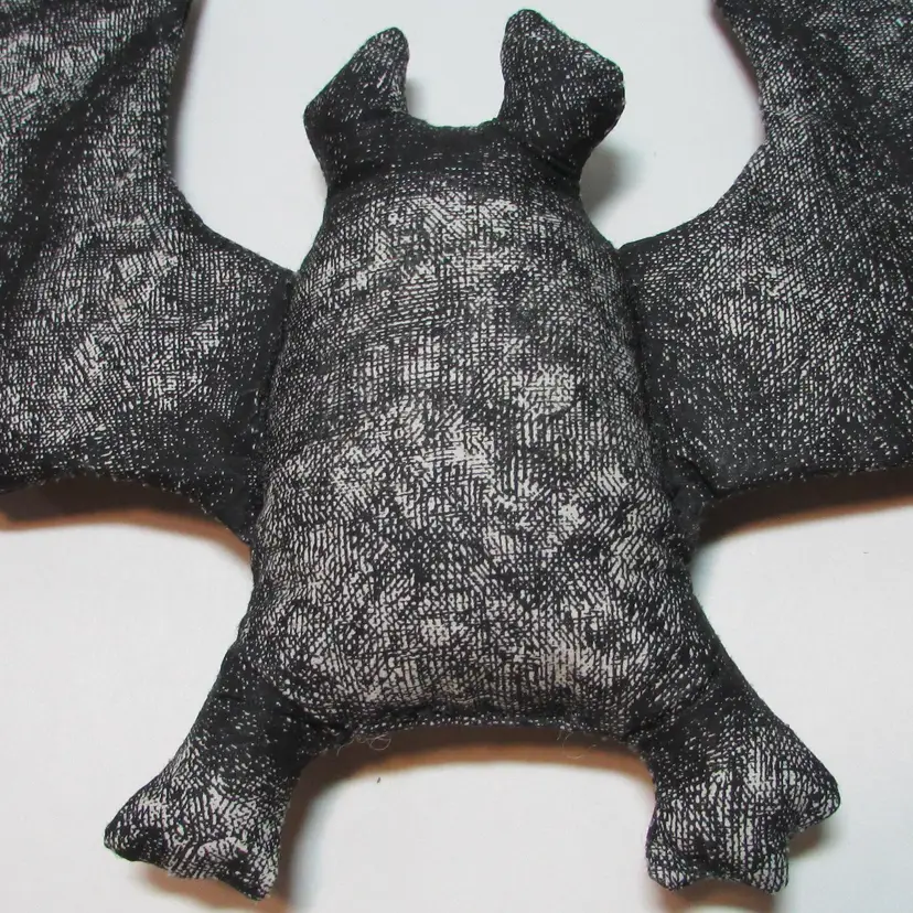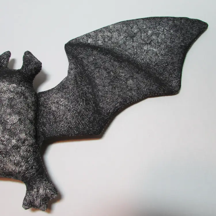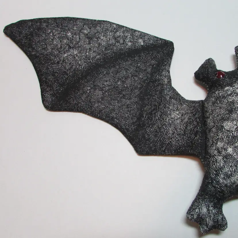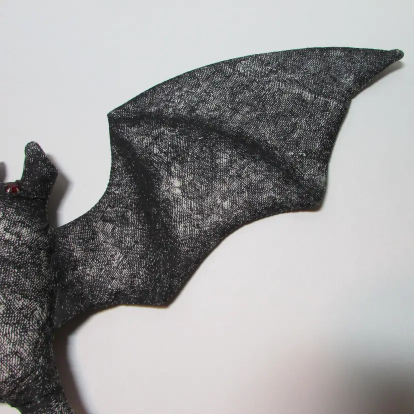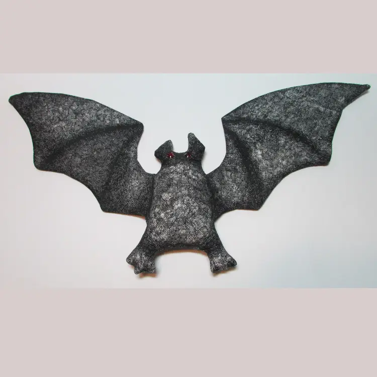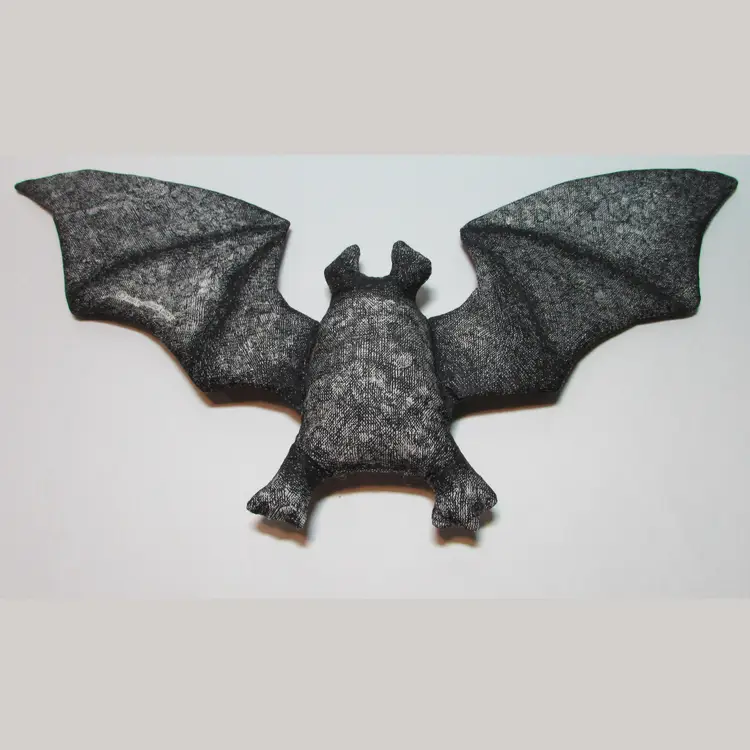 This lovely bat has a small rip on the front wing. It was a sew you own piece, the wings are flat and the body is stuffed with poly fil. Still a fun piece to display, it is about 14" x 7 1/2" x 1 1/2". This is shipped from a smoke free home. Thanks for looking! locfb16
