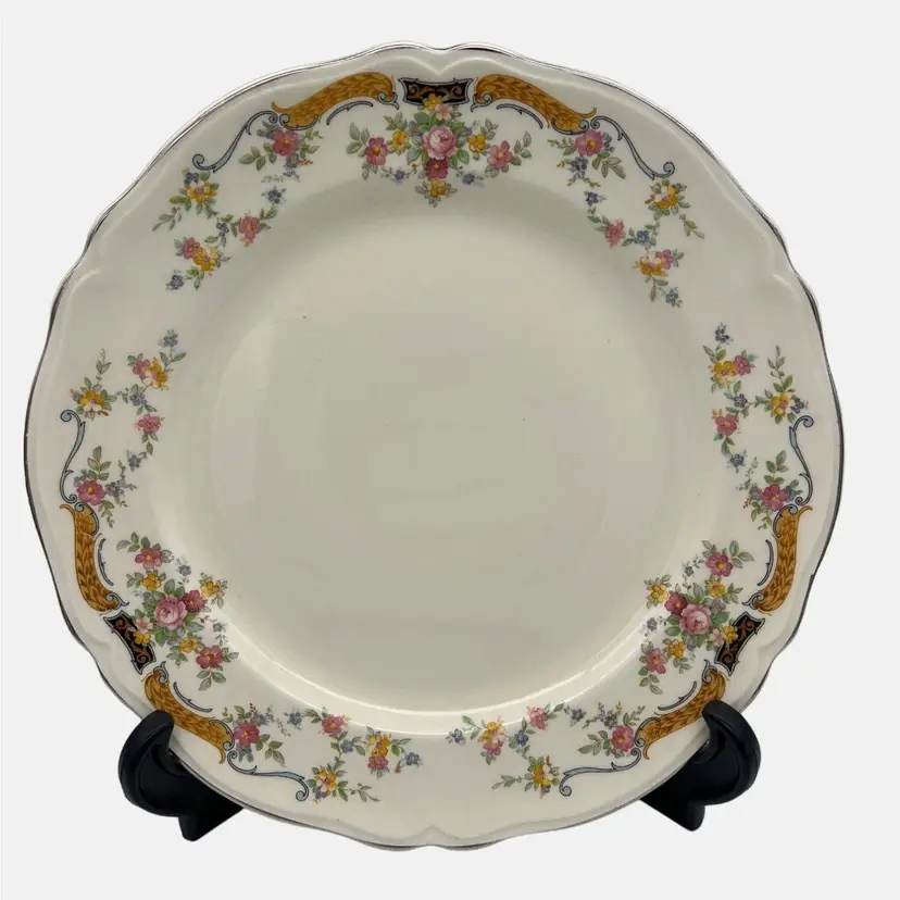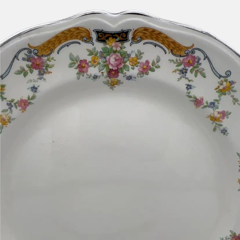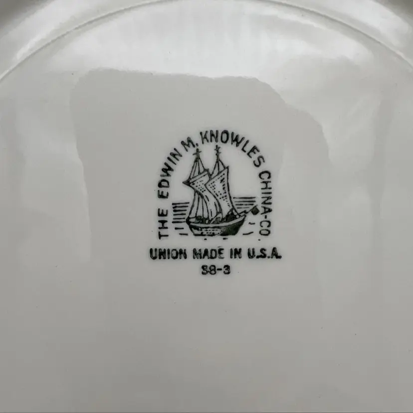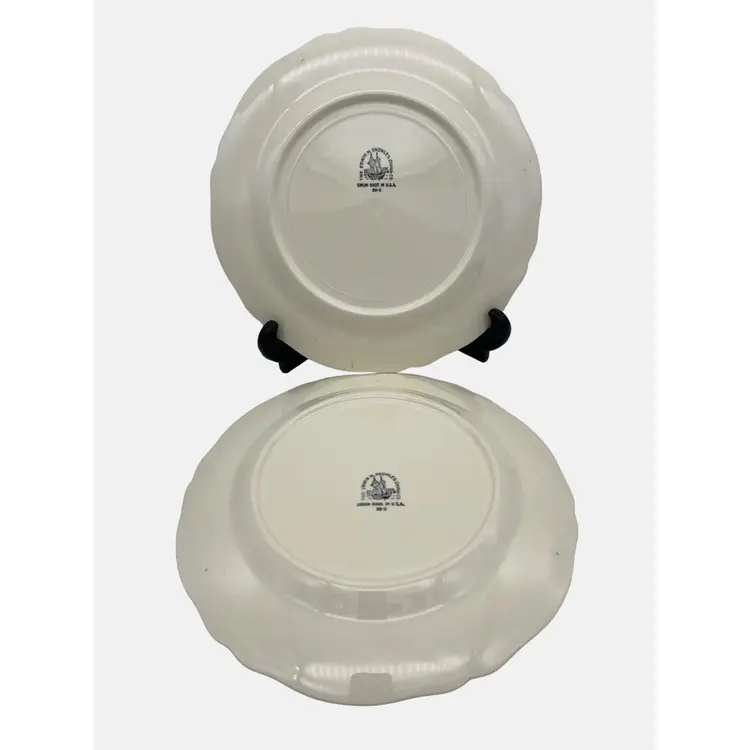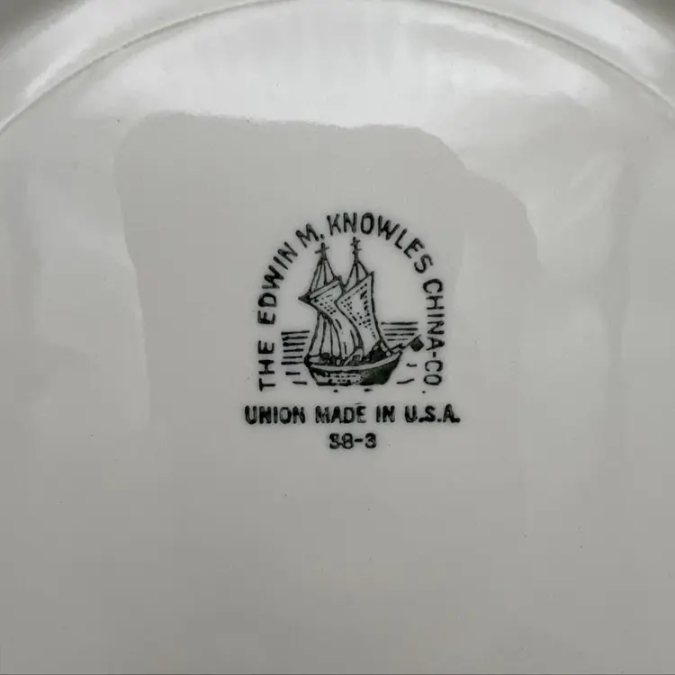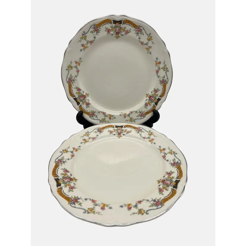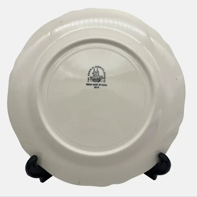 Pair of vintage luncheon plates from Edwin M. Knowles China Co. They are marked with the company name, an image of a ship, and the wording "Union Made in USA" on the back. The pattern name is not known but has floral garlands with yellow and blue scrolls. Each plate measures approximately 9.25" across.