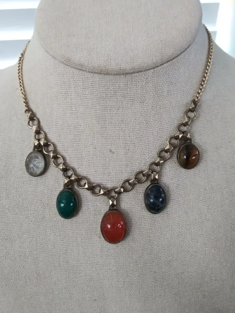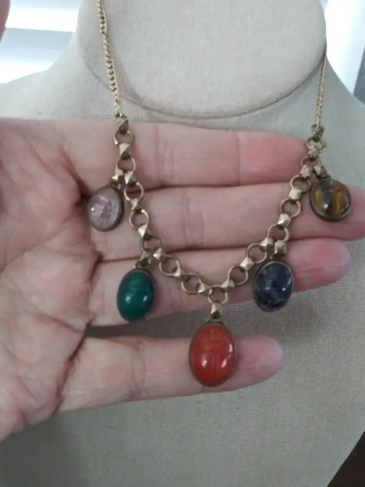 Very good condition. Quartz, Agate, Carnelian, Tiger's Eye, one more not ID. Thumbless ring spring clasp. Very beautiful. Probably early 1900s.