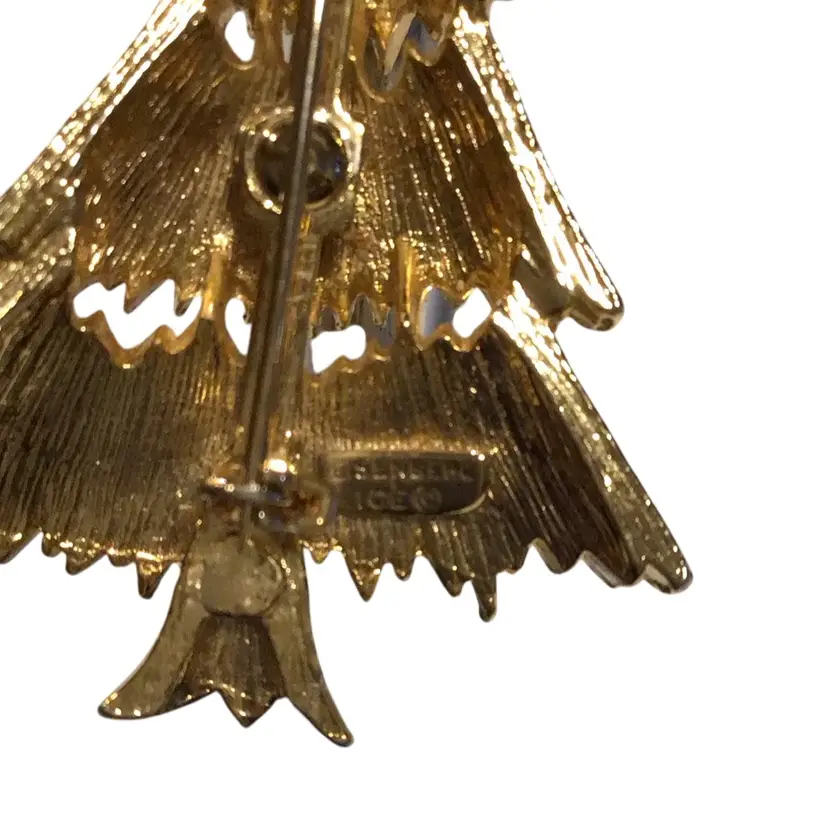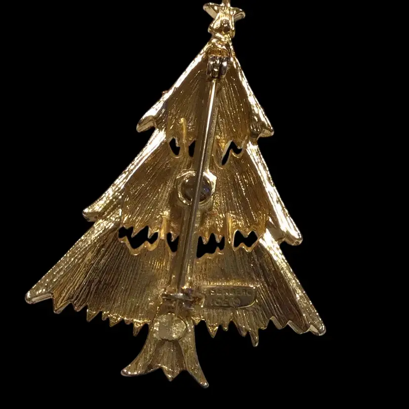 Multi color rhinestone Christmas tree on gold tone, 1960s. 2”x 1-1/2”. #085