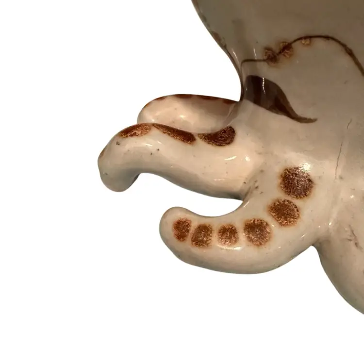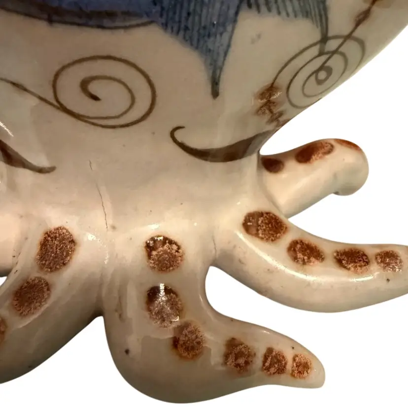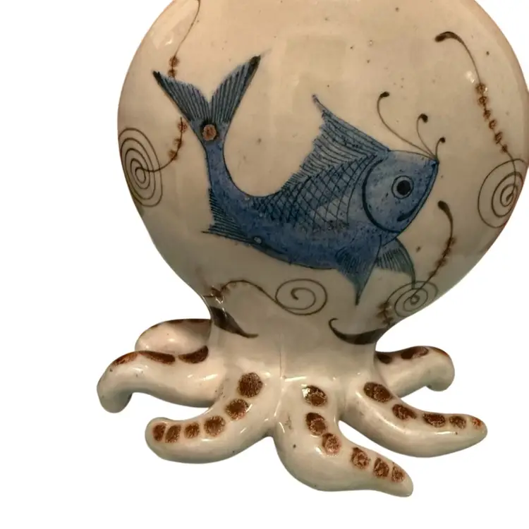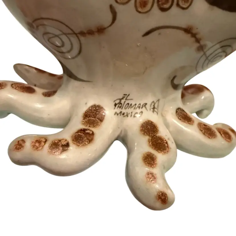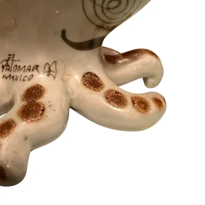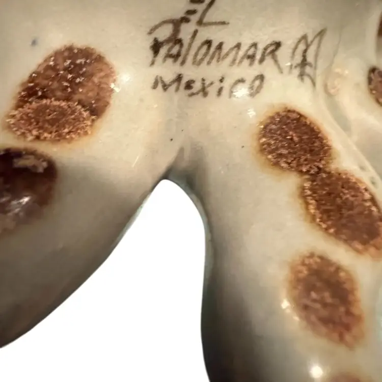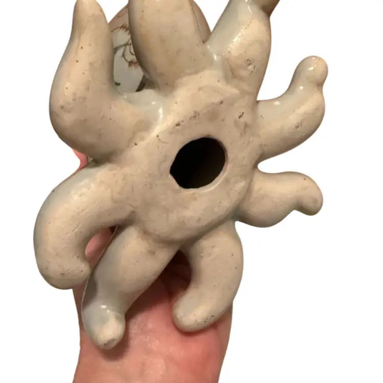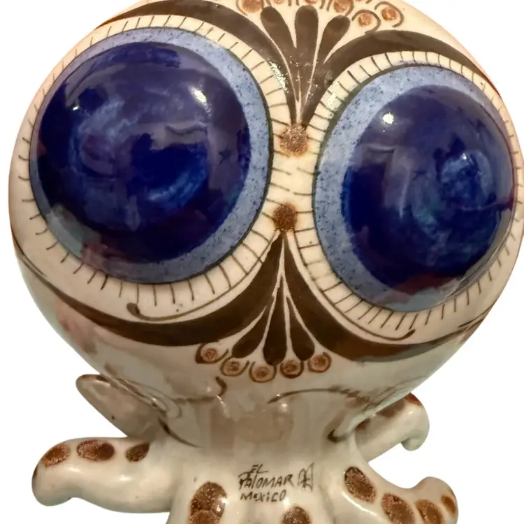 Approximately 7 1/2” tall Signed Nice blue anthropomorphic eyes No chips or cracks No crazing There are stress lines in the clay from the firing process. See all photos