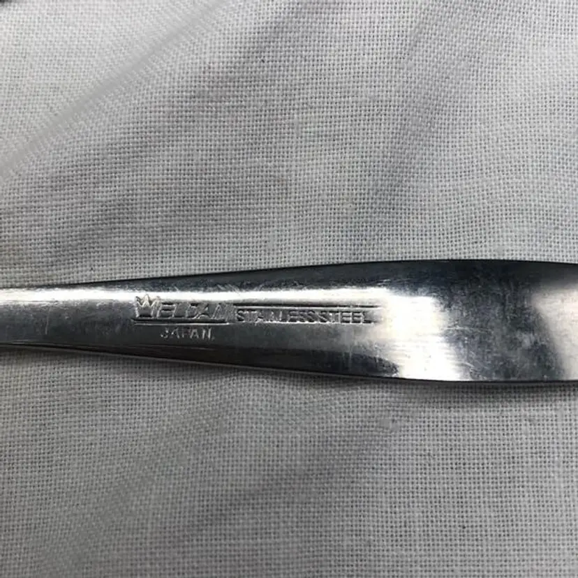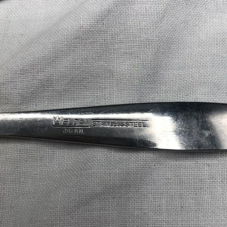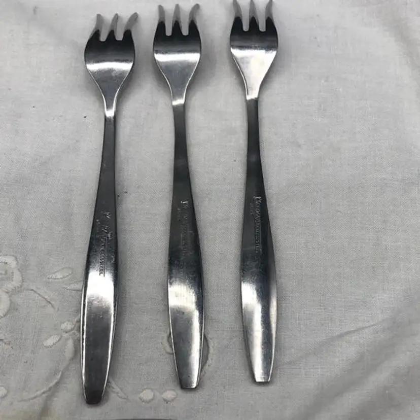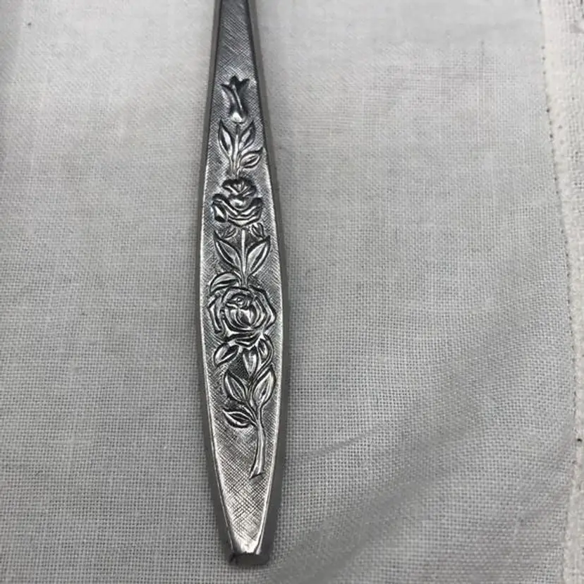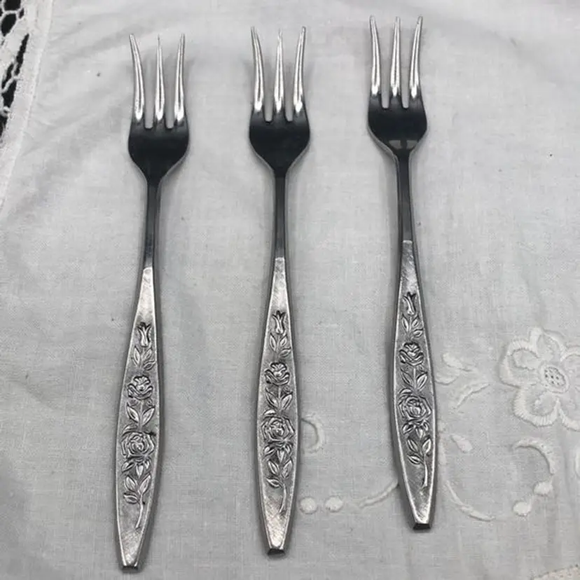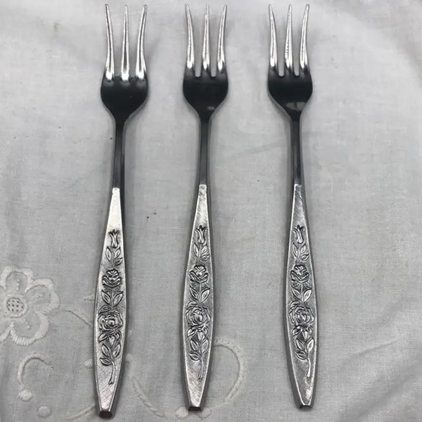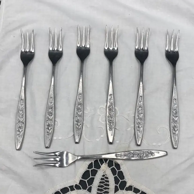 Vintage Eldan Stainless Steel Flatware Made in Japan Roses Pattern Satin Finish 7 Pickle/ Dessert Forks In Excellent Condition