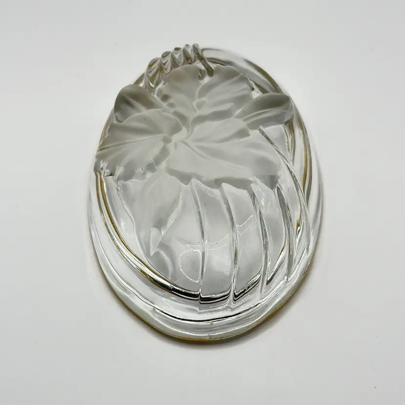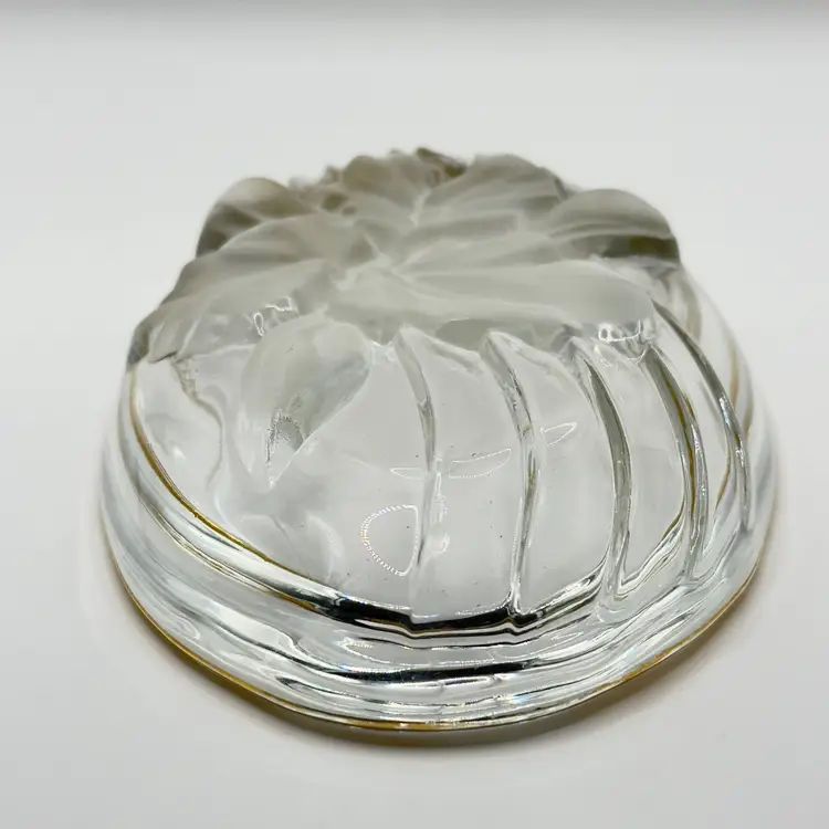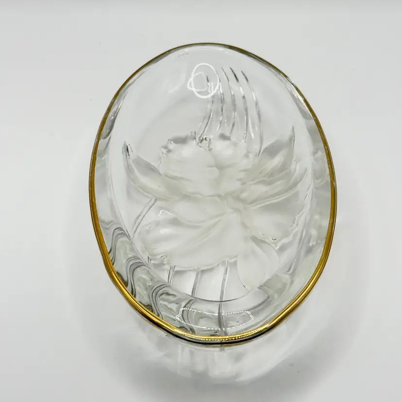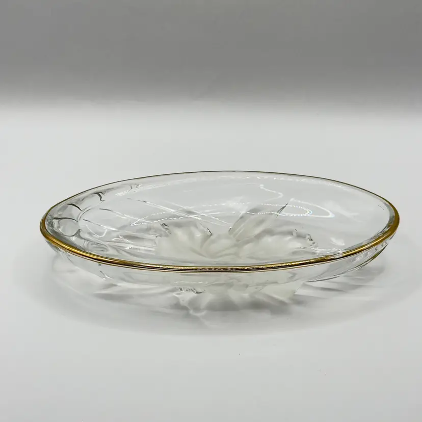 This beautiful vintage glass trinket dish features an intricate floral design and elegant gold trim. Perfect for adding a touch of sophistication to your home decor or as a unique gift. In excellent condition with no chips or cracks. Measures 8x5x1 inches. Weighs 1.5lbs.