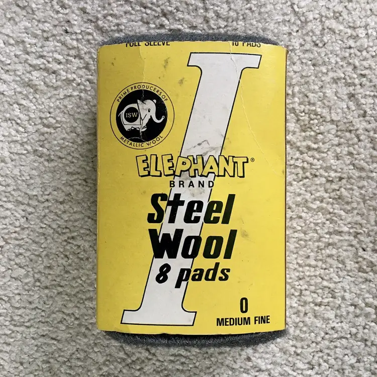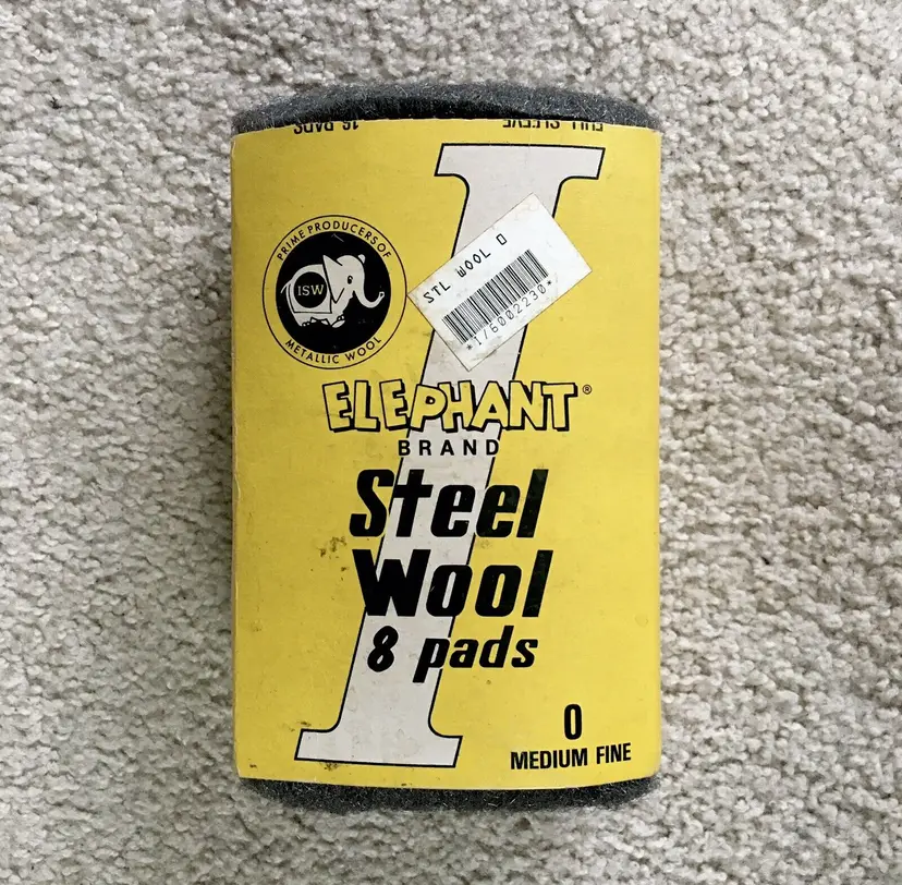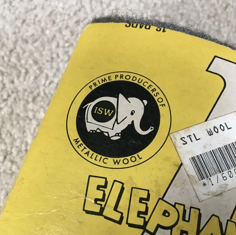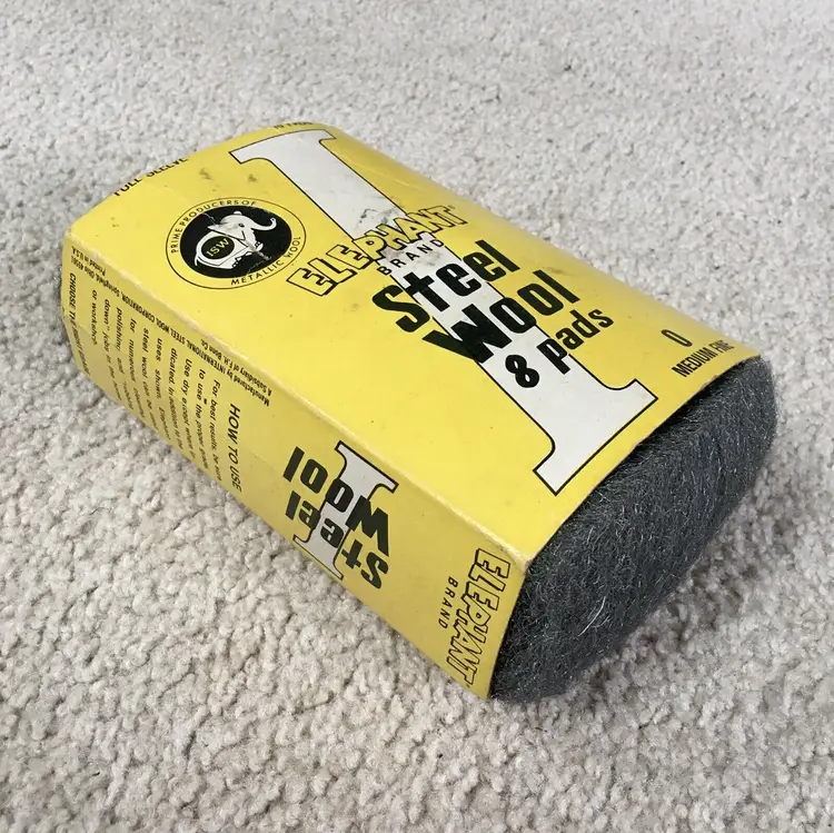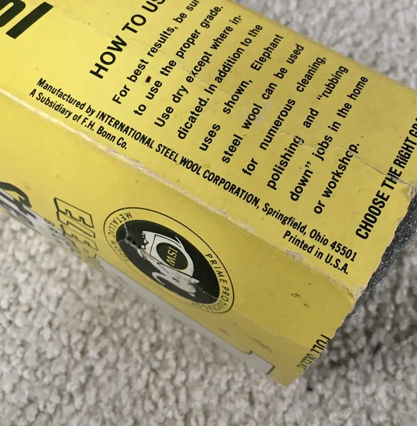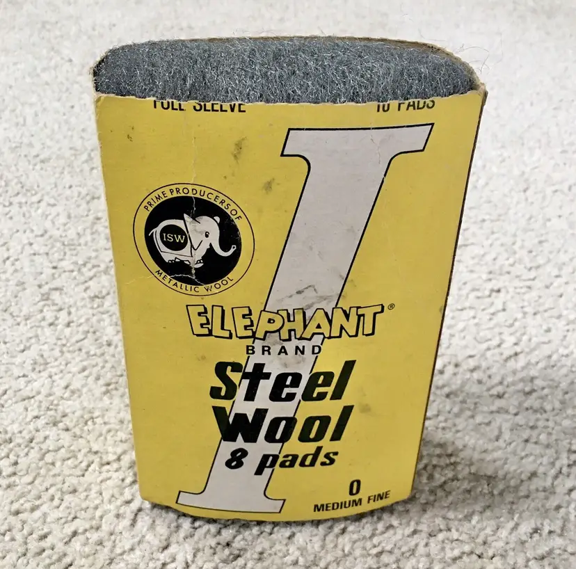 Very nice advertising item or for actual use!! Vintage ELEPHANT BRAND box of 0 Medium Fine steel wool made by International Steel Wool Corporation (ISW)… a subsidiary of F.H. Bonn Co… in Springfield, Ohio. International Steel Wool Corp. began in 1924 and was a leading manufacturer of steel wool products for many years. Box has been opened, but complete with all 8 steel wool pads. Directions for use and the company steel wool product line on sides of box. Box is in very good condition with minor wear from storage. A few creases as shown. All 8 steel wool pads unused and in like new condition. Box measures about 6.75” x 4.5”. Each steel wool pad measures about 4.5” x 2.5”. See pics for more details and zoom in for closeups.