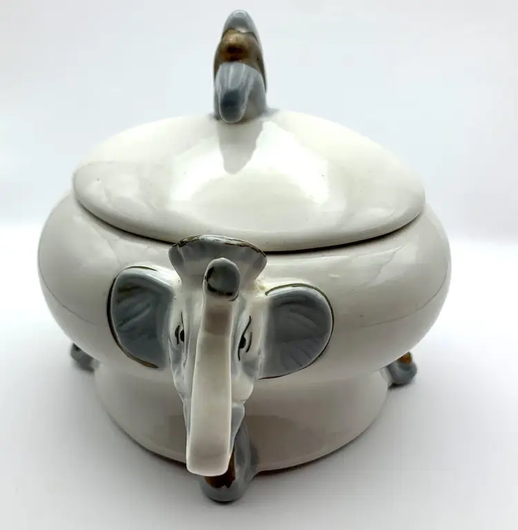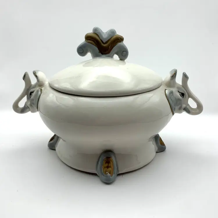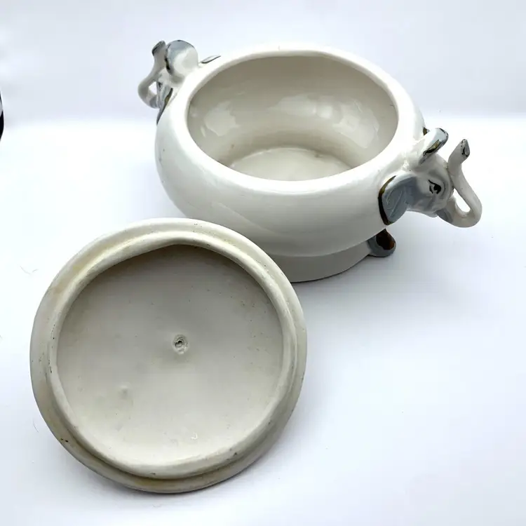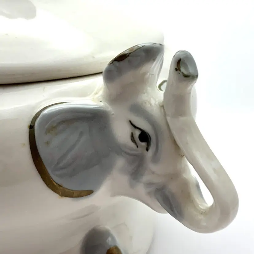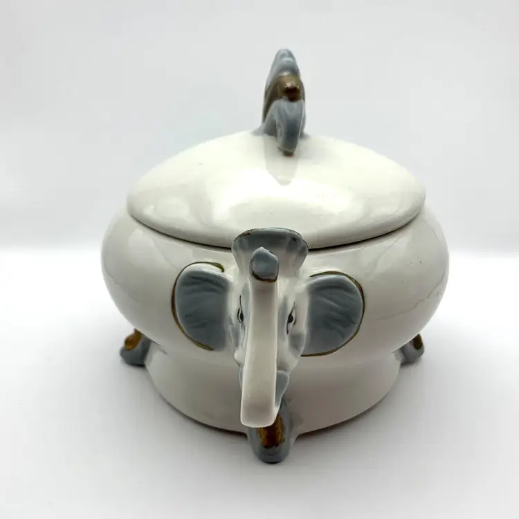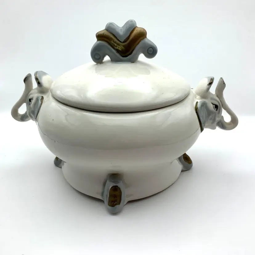 Vintage porcelain elephant head handle pedestal bowl with lid is handpainted in light blue and a dark gold/metallic paint. This could possibly be an antique piece, but it is not marked. Very unique piece.