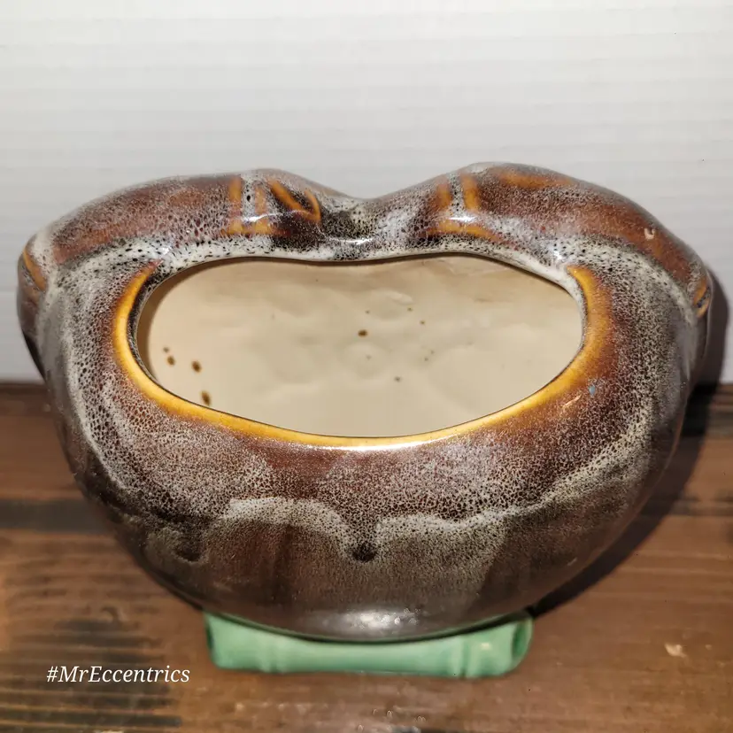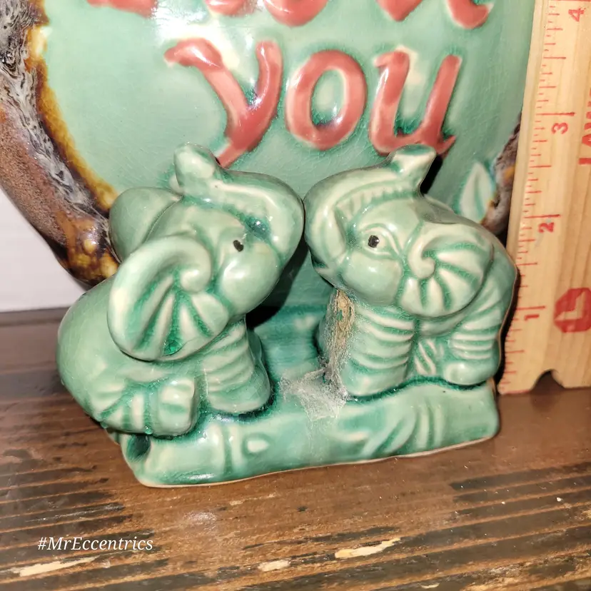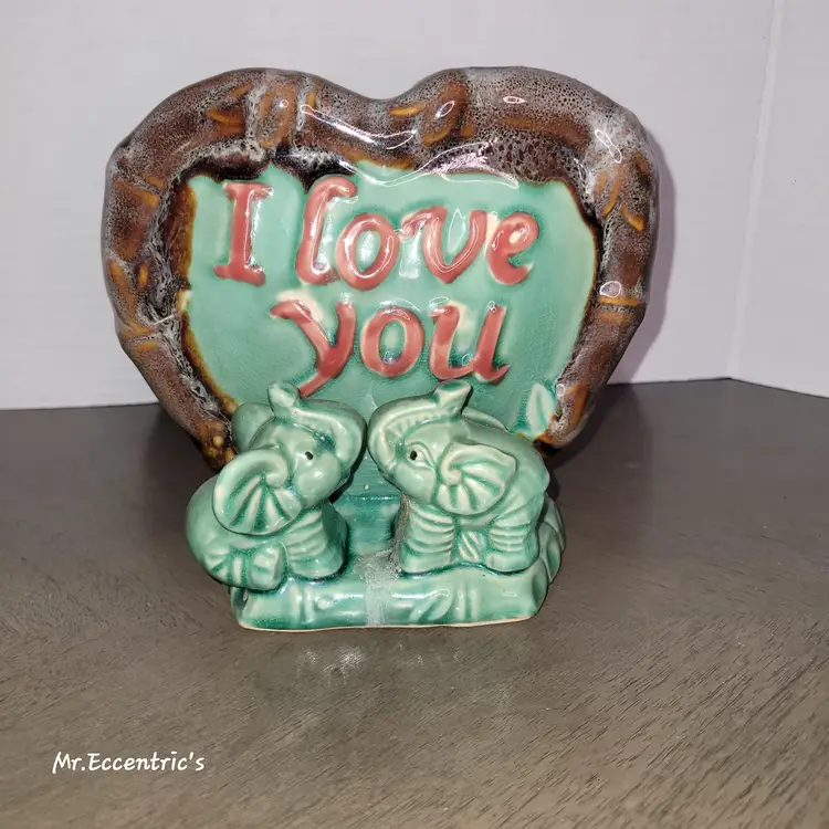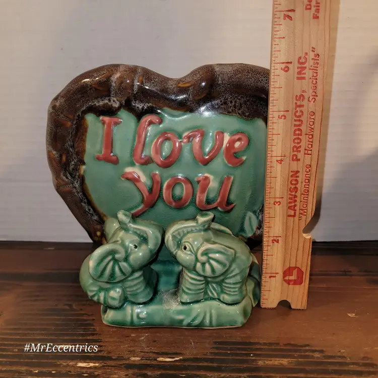 Adorable vintage ceramic planter featuring two charming elephants and a heart with 'I Love You' inscribed. Perfect for adding a touch of whimsy and love to your home decor. Ideal for small plants or as a decorative piece.