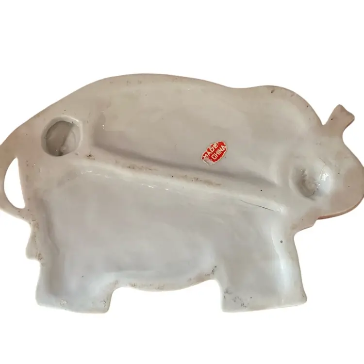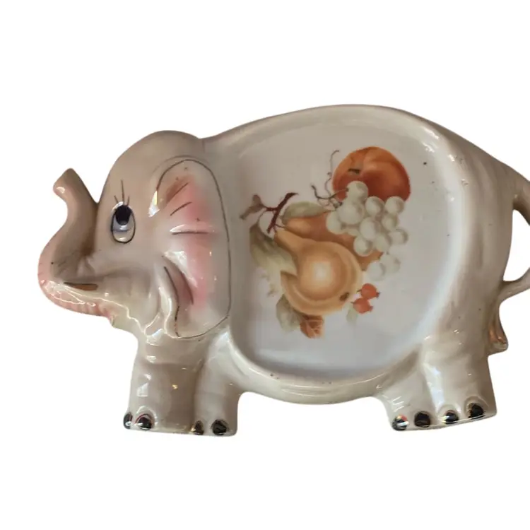 Cute 7” x 5” elephant spoon rest or trinket plate. Belly has painting of fruit. A little bit of paint loss.
