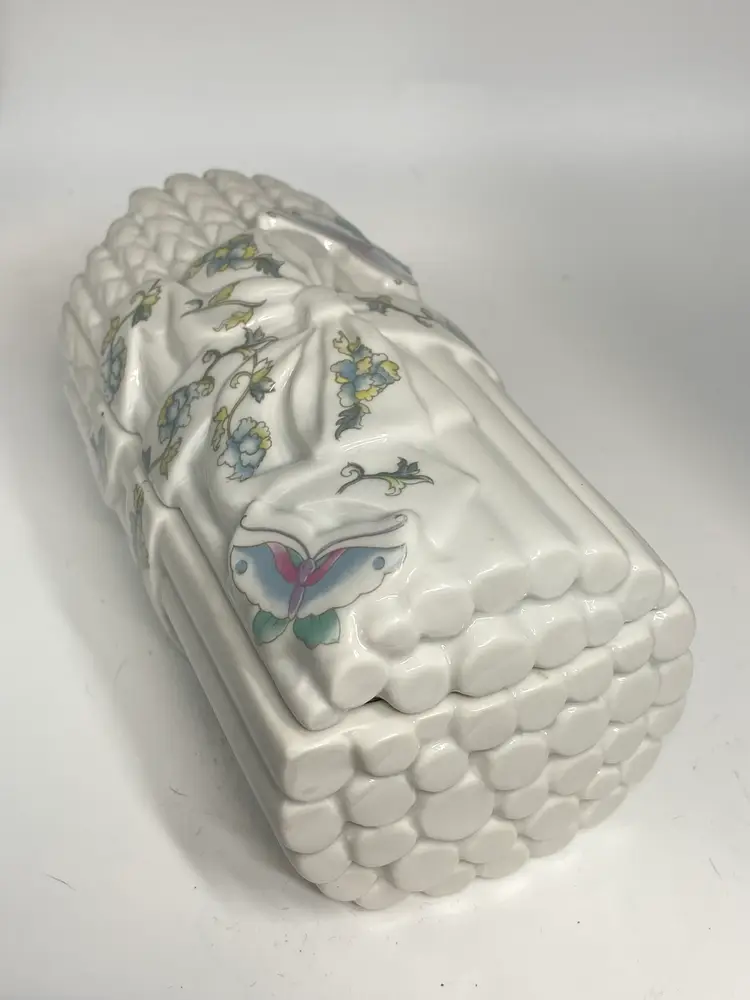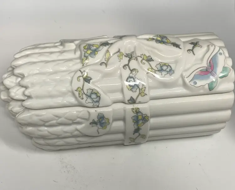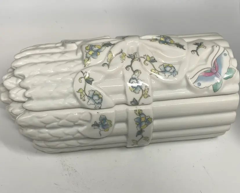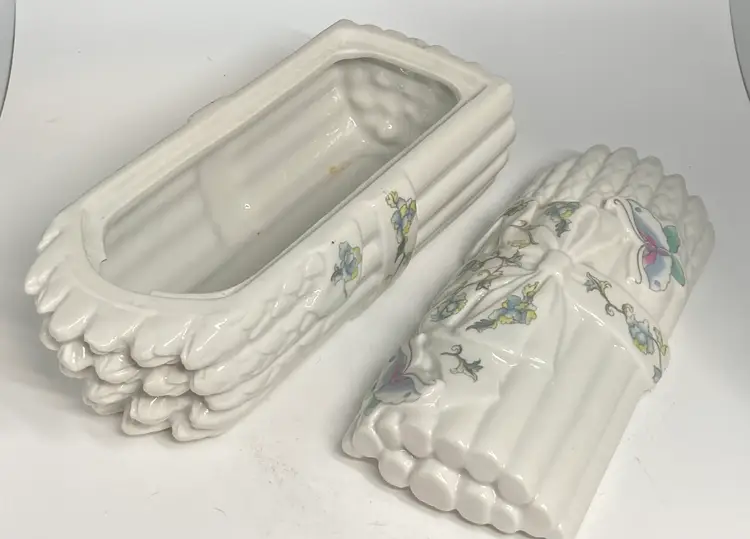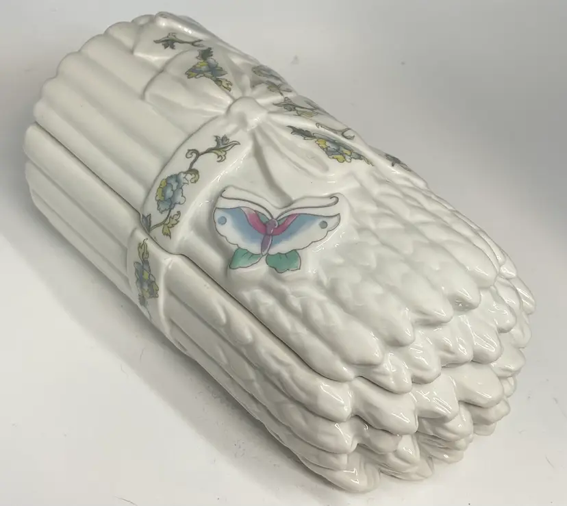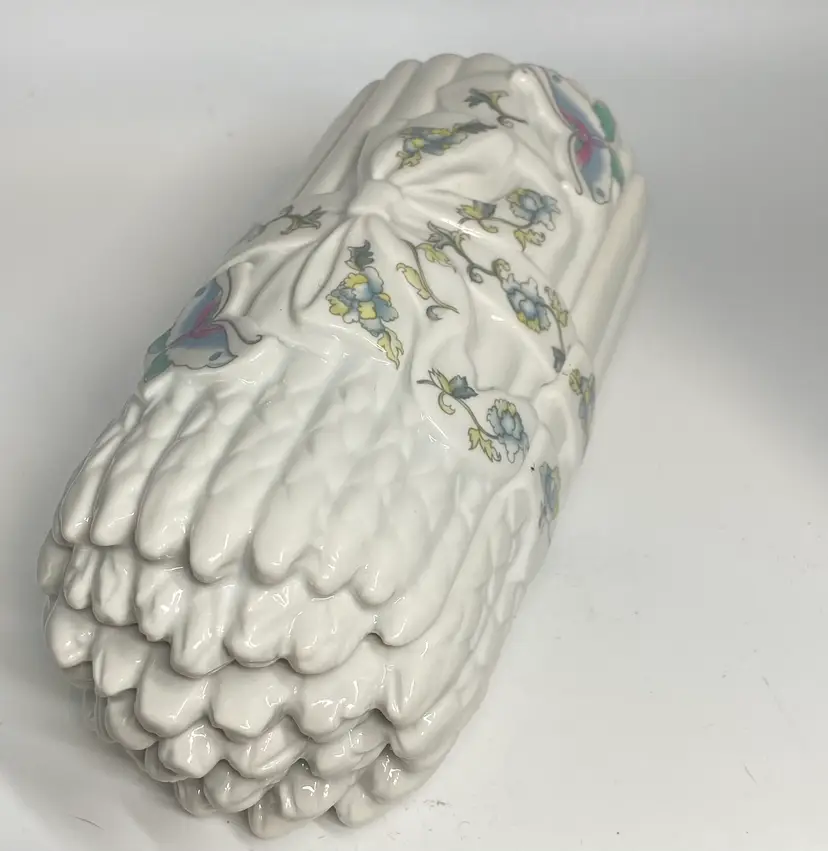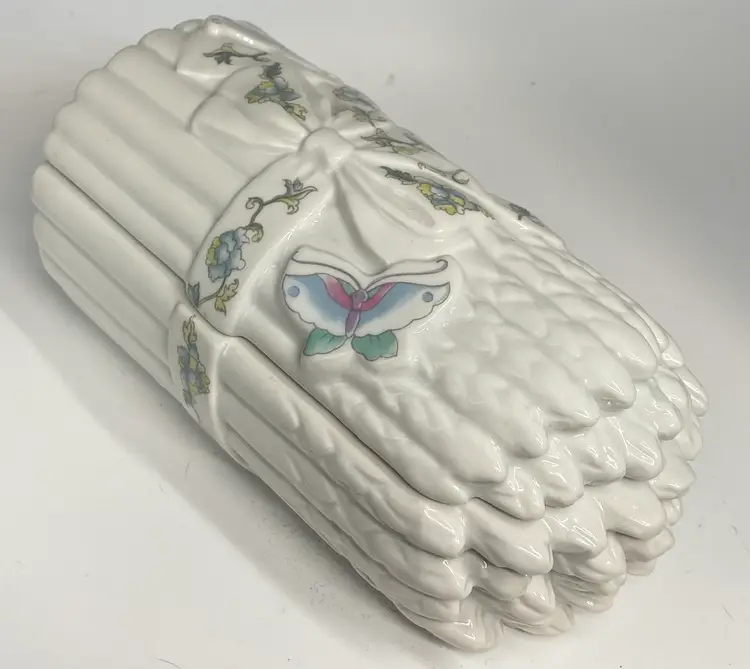 This Vintage Elizabeth Arden Ceramic Asparagus Bundle is a unique decorative collectible featuring a set of three tall and seven wide figurines depicting asparagus. Made from white ceramic, these vegetable-themed figurines are medium-sized and weigh about 1 pound each. Perfect for collectors or those looking to add a touch of nostalgia to their home decor, this bundle captures the elegance and charm of classic Elizabeth Arden design.