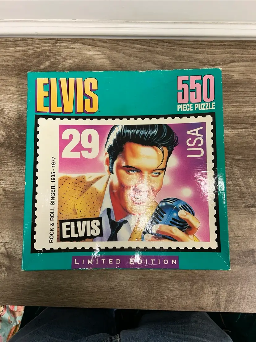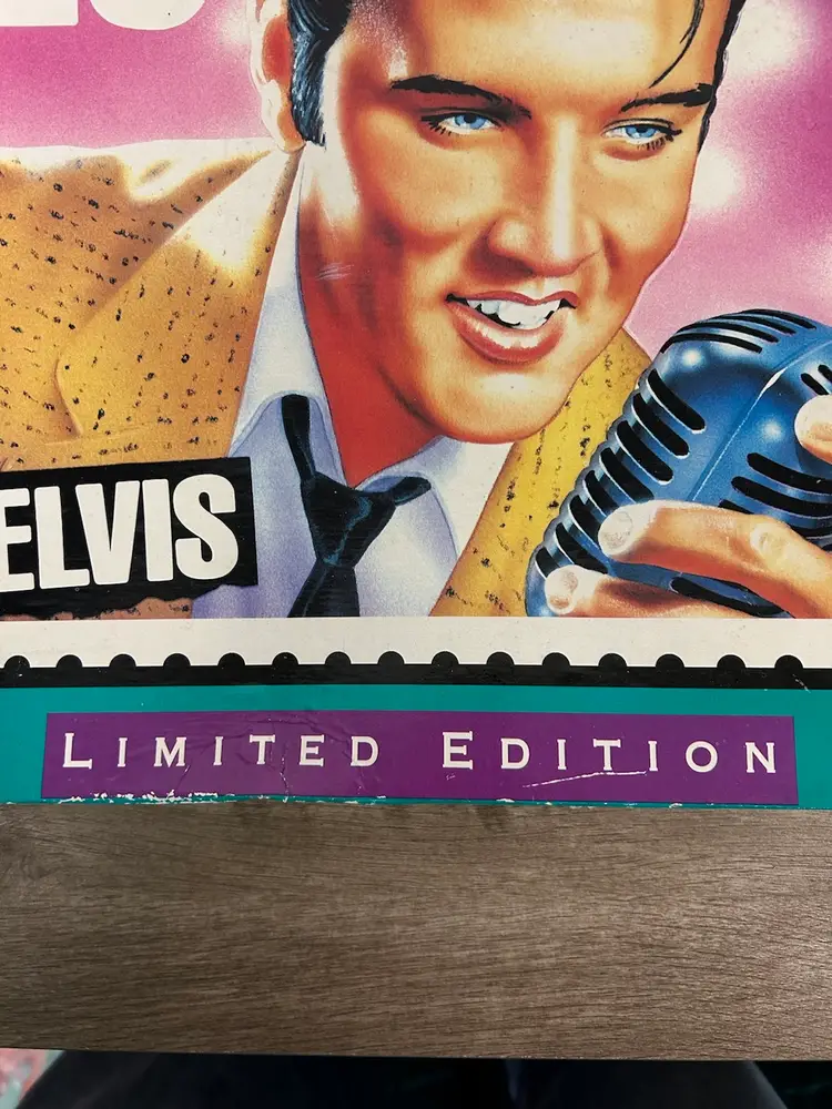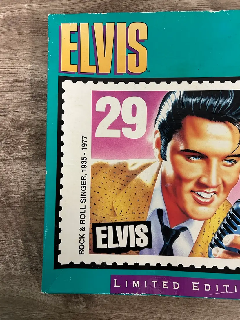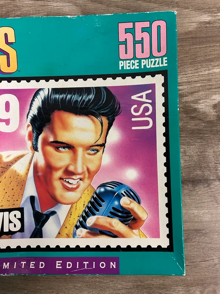 This sealed limited edition puzzle features the iconic Elvis Presley. The puzzle has 550 pieces and is made of cardboard which is 18"x 24". It is sealed and unopened. The box has some wear and aging as you can see from the pictures. It is recommended for ages 10 and up. The puzzle is made by Milton Bradley and was manufactured in the United States in 1992. The box is a little mashed from storage.