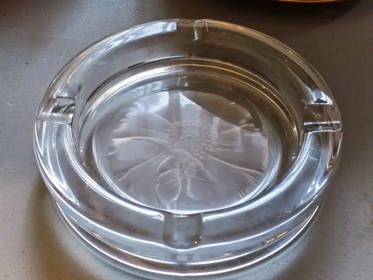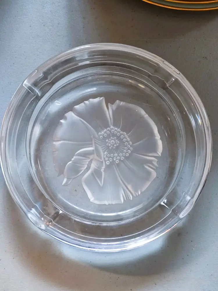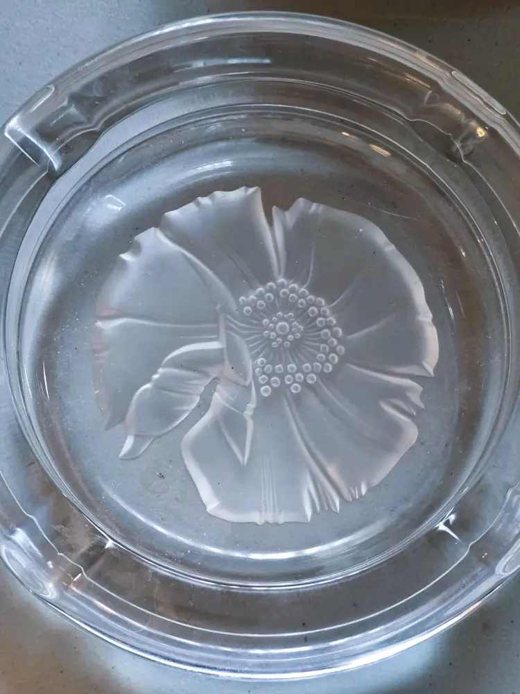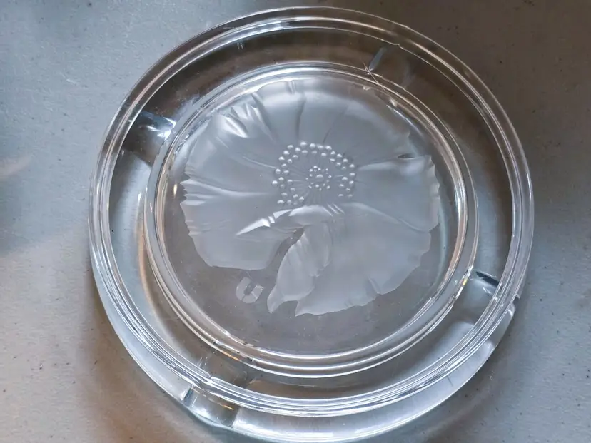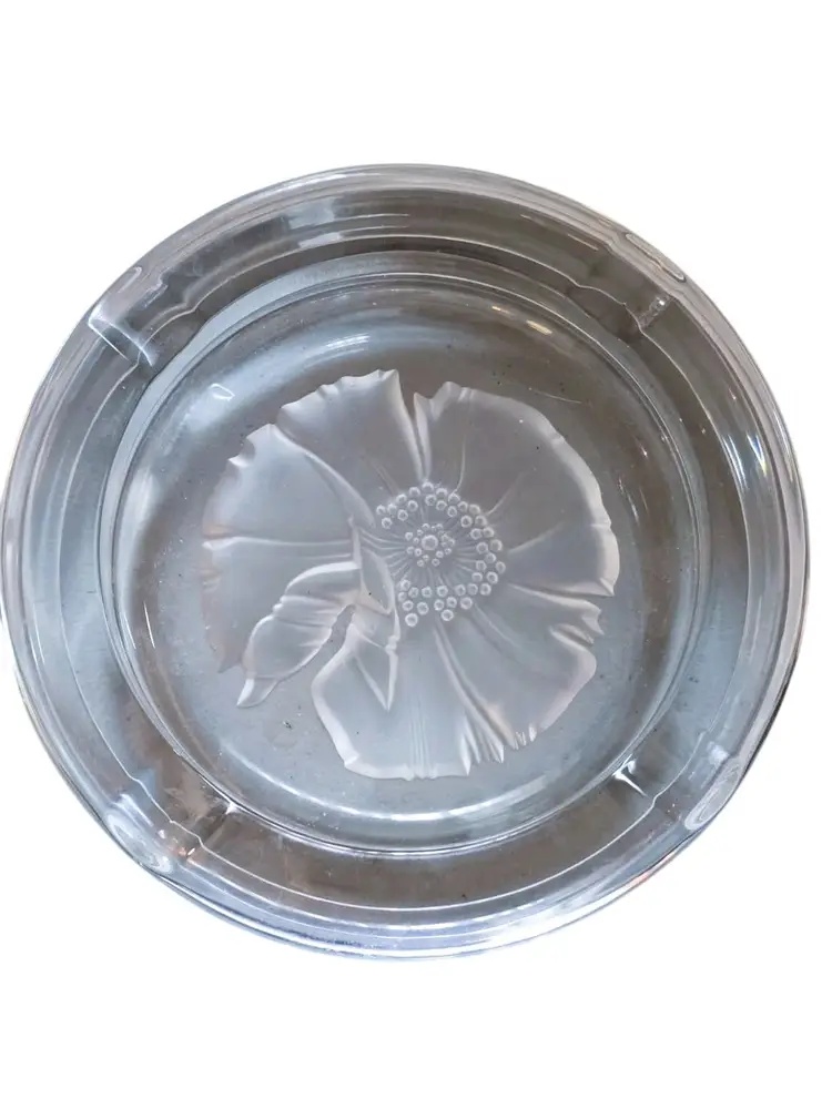 Size: Measures approx. 7 3/4" in diameter x 1.5" tall. Color: Clear Condition: Very good vintage Details: Beautiful heavy Emanuel Ungaro Sasaki crystal ashtray with an etched frosted flower. Made in Japan. Marked. Came from a Long Island estate.