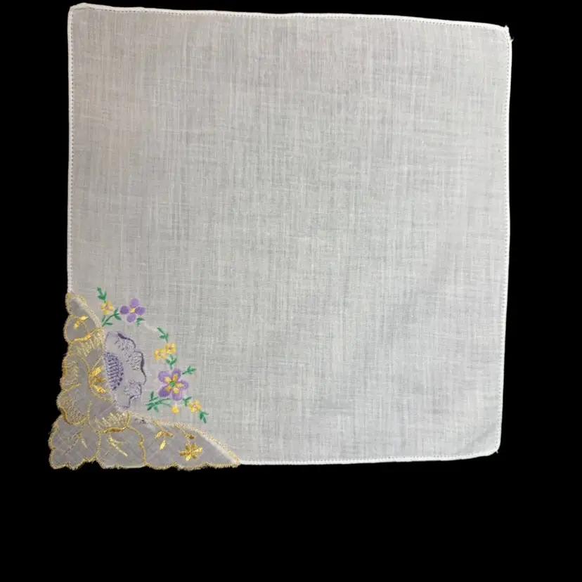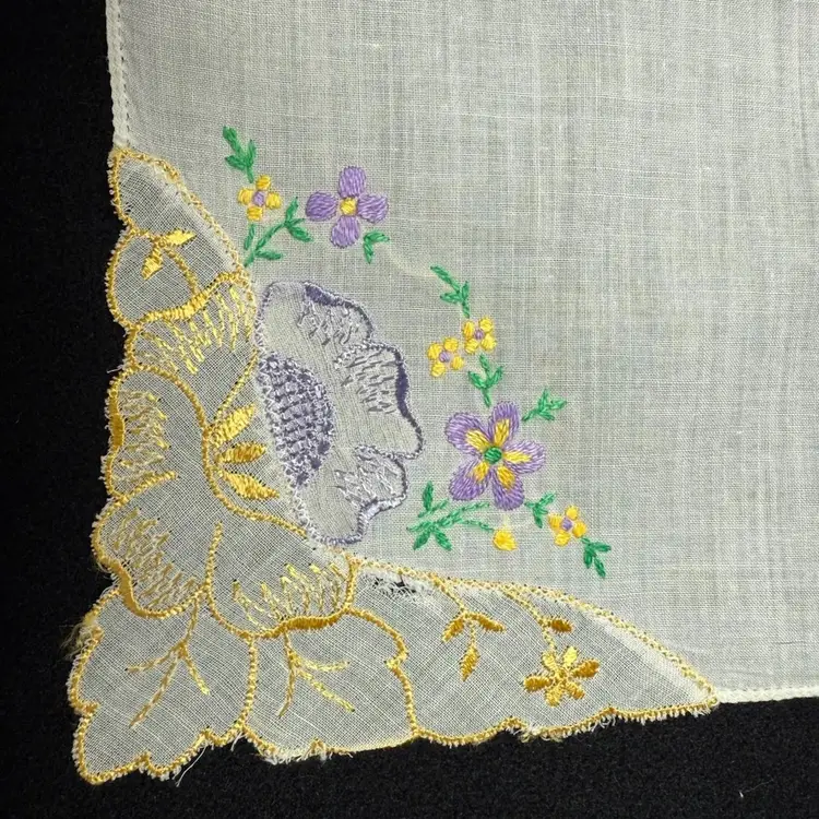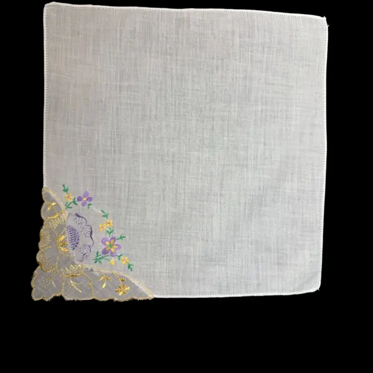Fine white cotton handkerchief. Hemstitched edge. One corner features a large, detailed flower with purple and gold embroidery, while smaller purple and yellow flowers with green stems and leaves adorn the surrounding area. One small tear in embellishment as shown in photos. Very good condition. 9 ½”x 9 ½”