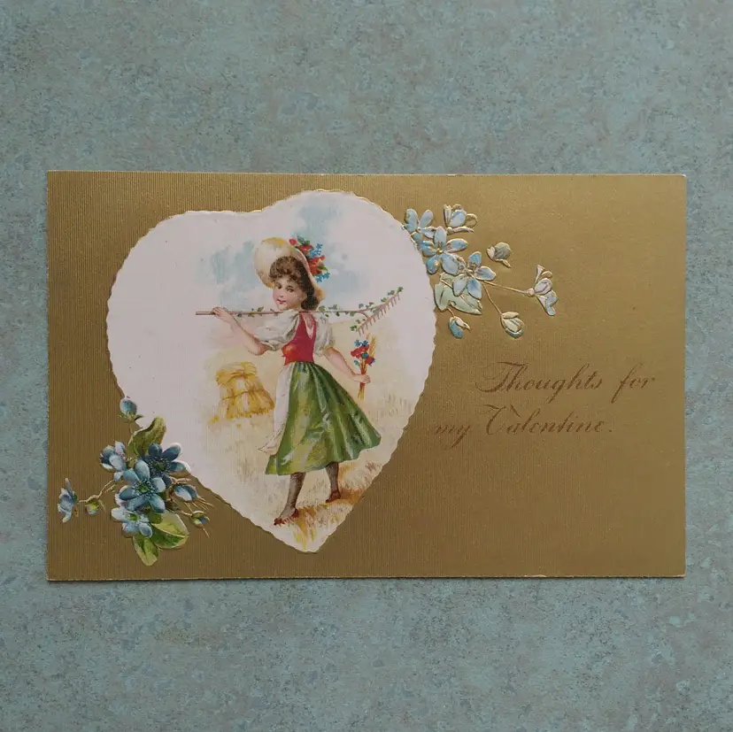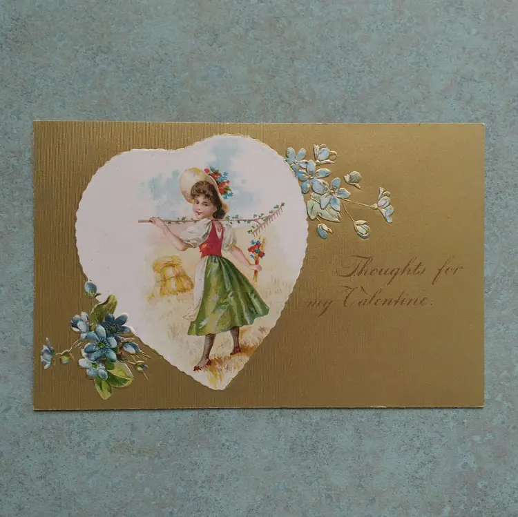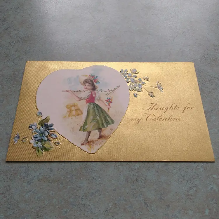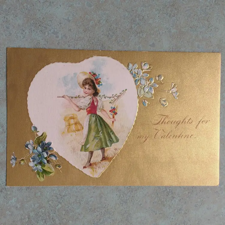 Embrace the nostalgia of yesteryears with this delightful vintage Valentine card. Featuring a charming illustration of a young girl with flowers, set against a heart-shaped backdrop, this card is a perfect addition to any collection of vintage ephemera. The elegant gold background and floral accents add a touch of timeless romance, making it an ideal gift for someone special or a treasured keepsake.