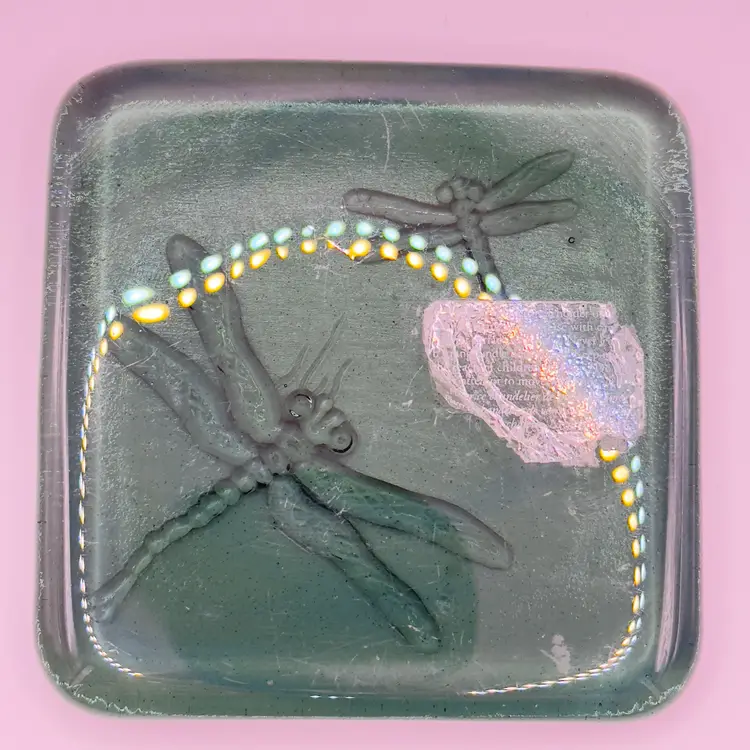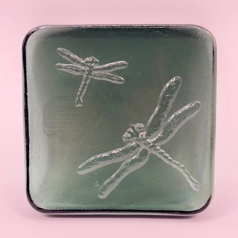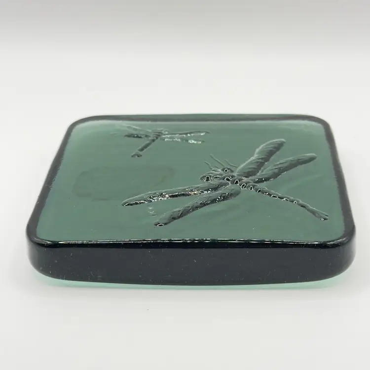Vintage Embossed Dragonfly Green Glass Pillar Candle Holder Paperweight, Elegant Square Tile Design, By Premium, Made in China