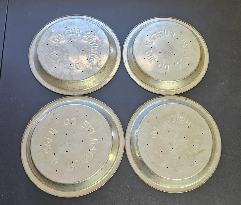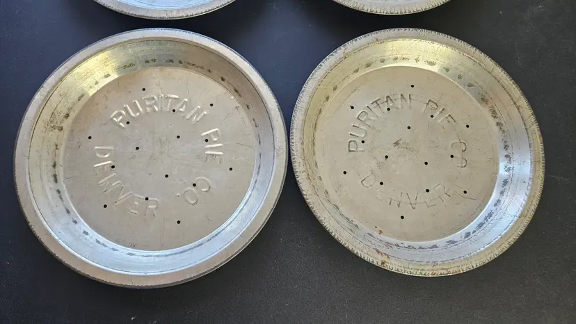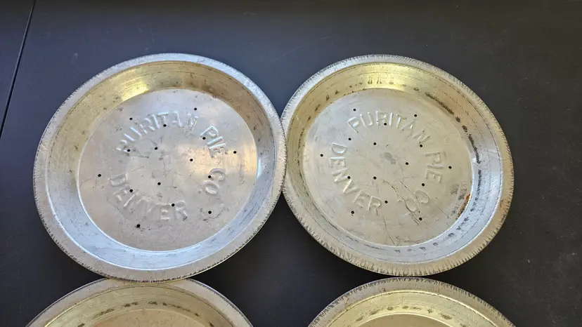 Lot of 4 vintage metal pie pan (tin or aluminum) stamped with Puritan Pie Co Denver CO. Heavy construction with air holes in the bottom for venting while baking. In good vintage condition with some black marks from use and age but very little rust. Lot of 4 is a great deal for collectors, resellers or businesses with vintage kitchen and baking decor! Measures almost 10" lip to lip, 7 & 1/2 inches is base size.