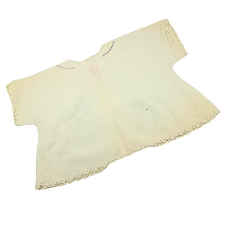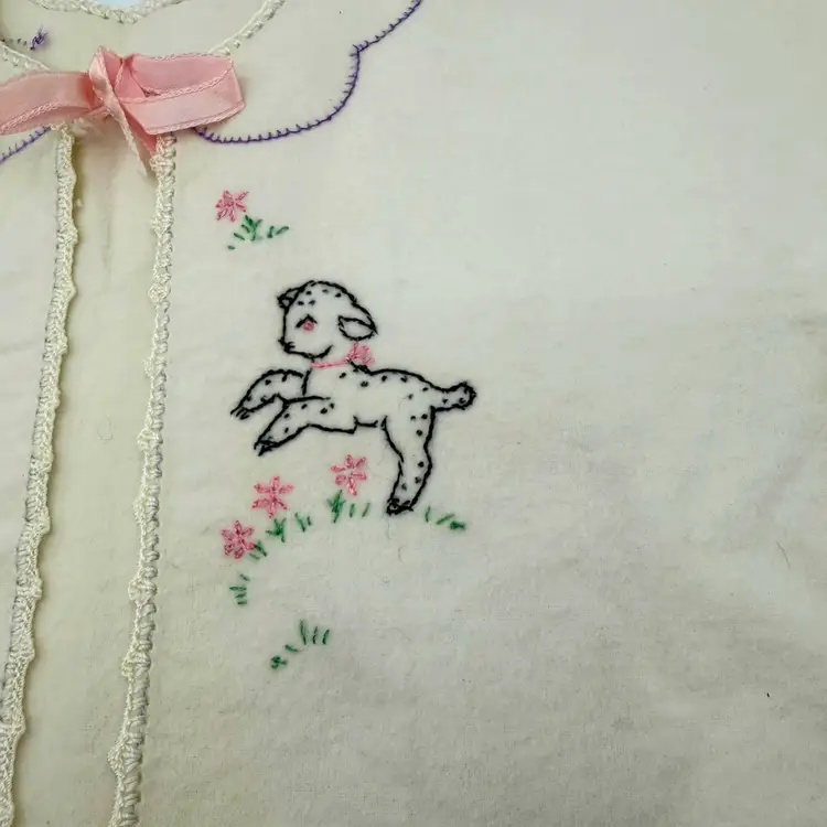 Vintage Baby Robe Little Lamb Embroidery Ivory White Flannel Bed Jacket Cardigan Pink Floral Trim Infant Gown Handmade Nursery Keepsake