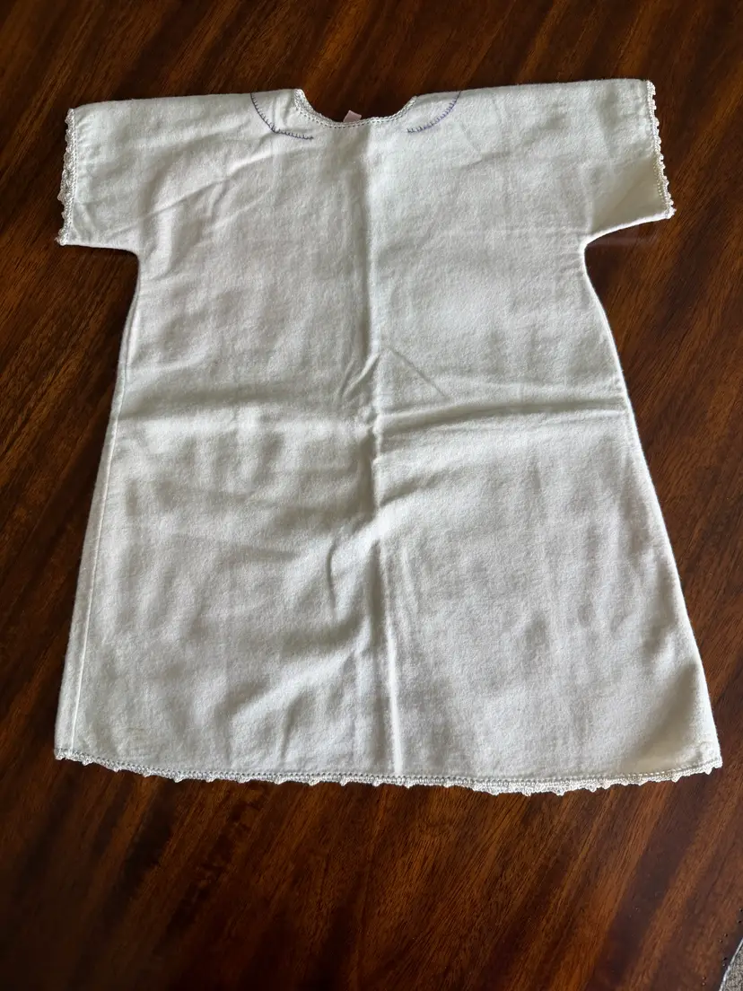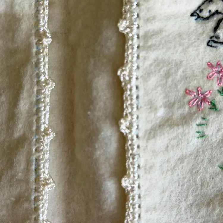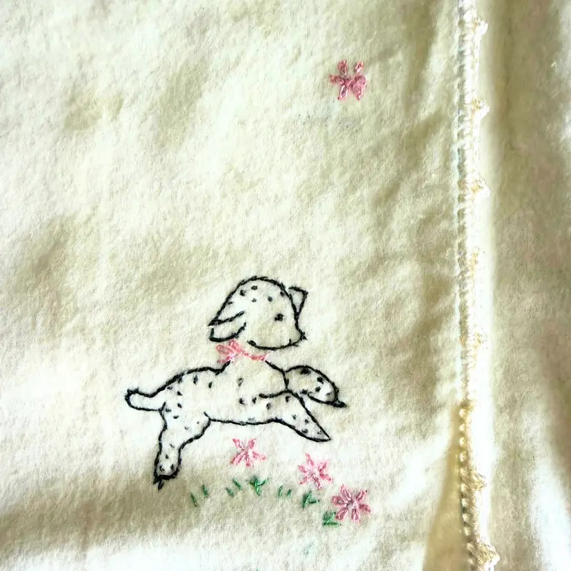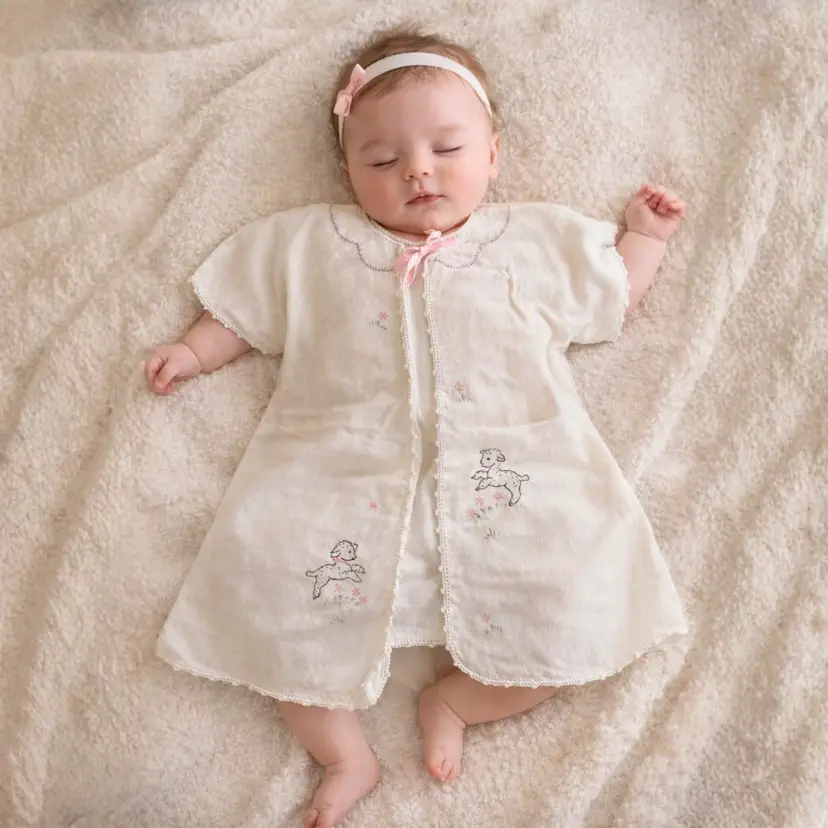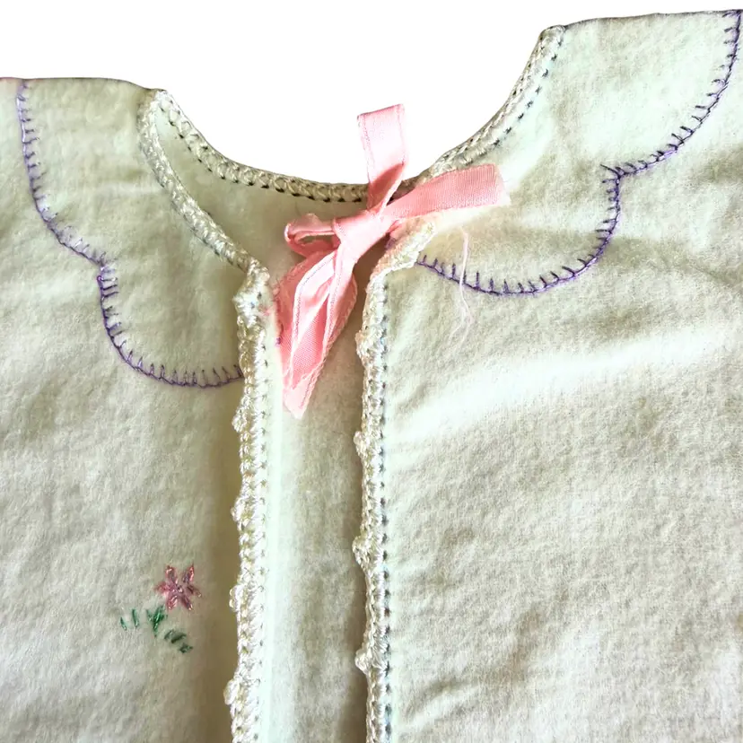 Vintage Baby Robe Lamb Embroidery Ivory White Flannel Bed Jacket Pink Floral Trim Infant Gown Handmade Nursery Keepsake