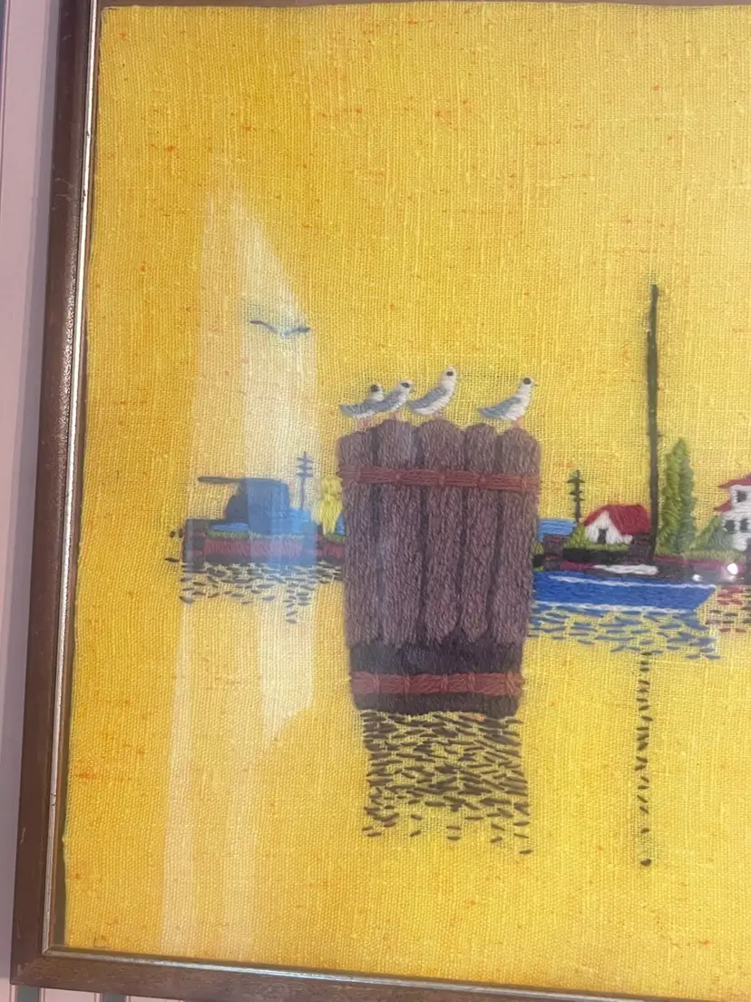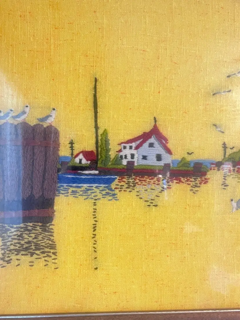 Beautiful vibrant embroidered crewel featuring a harbor scene with seagulls flying and resting 21”x17 “ Great used condition