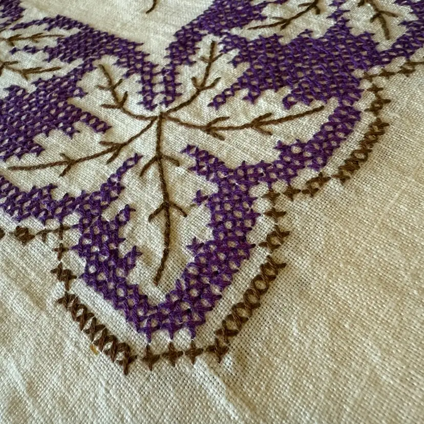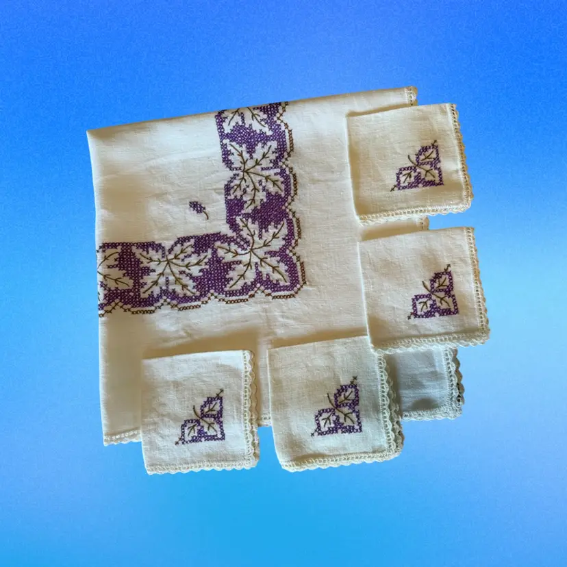 Beautifully hand embroidered tablecloth with 4 matching napkins. Lightly aged to ivory medium weight linen. Crocheted ivory scalloped edging. Purple and brown leaf motif embroidered border. Excellent condition. No marks or stains. Tablecloth is 31”x 33” Napkins are 11”x11”