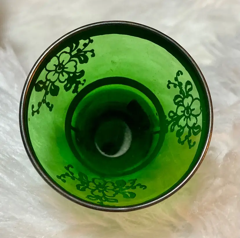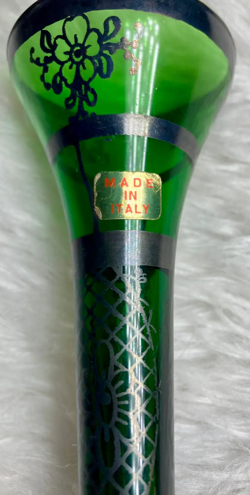 Offers welcome Vintage Emerald Green Italian Hand Blown With Silver Inlay Bud Vase.