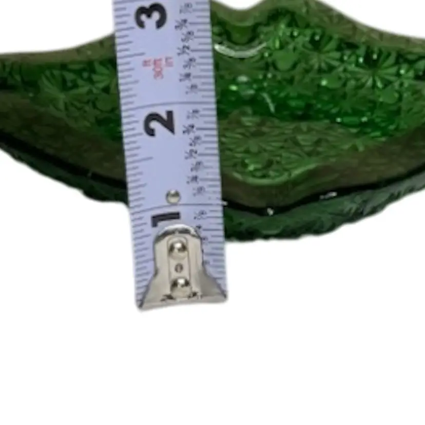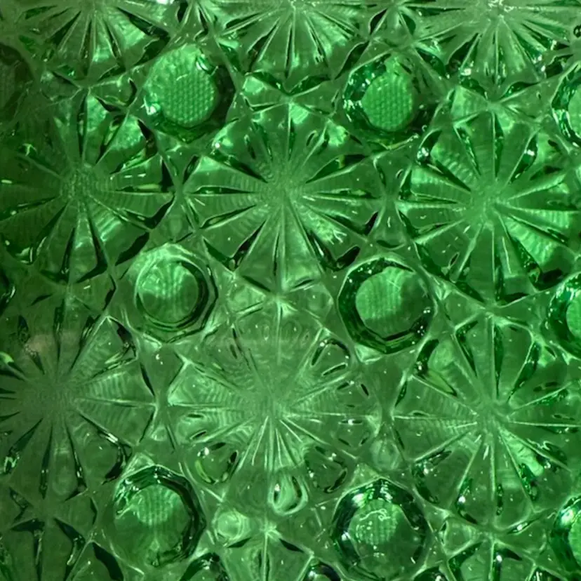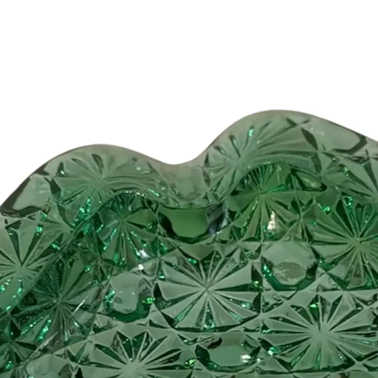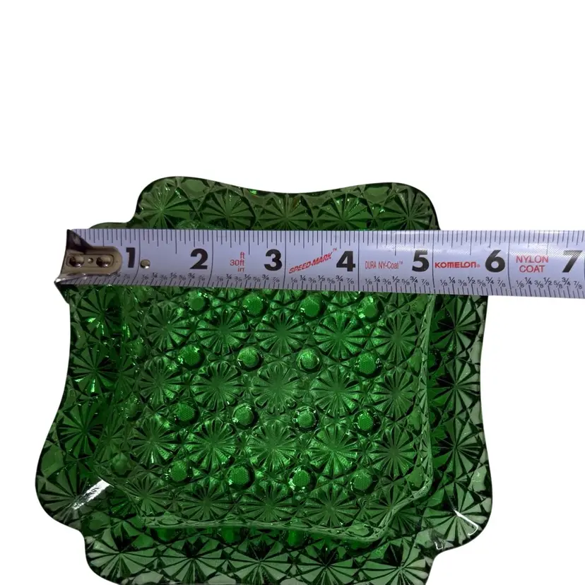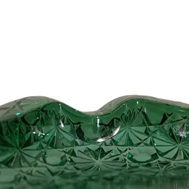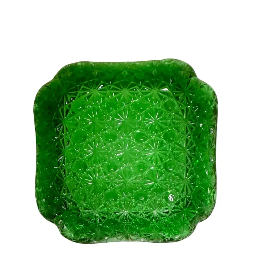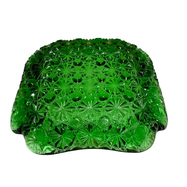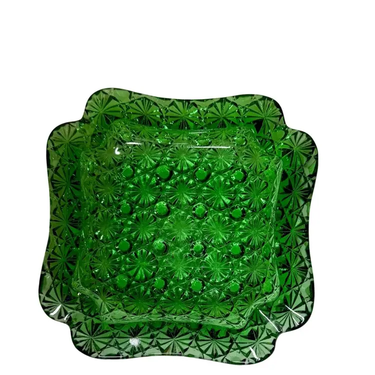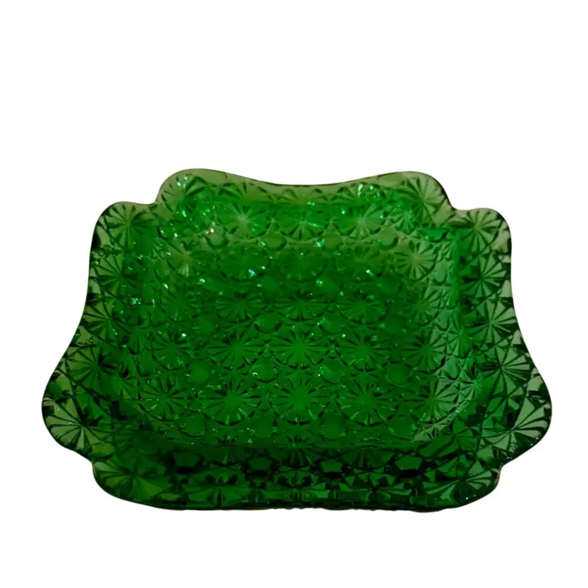 Vintage emerald, green square ashtray, trinket, candy dish. Daisy & button pattern.