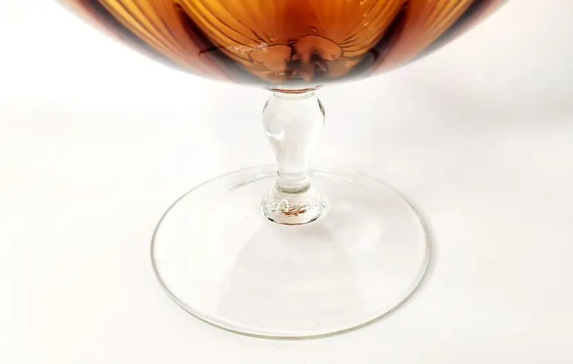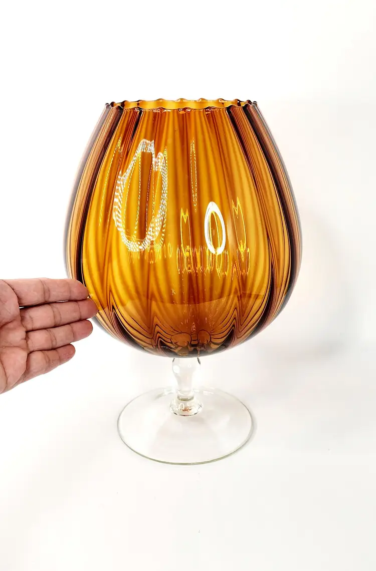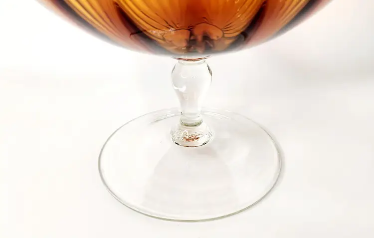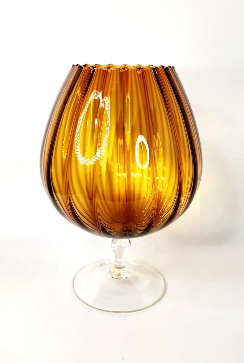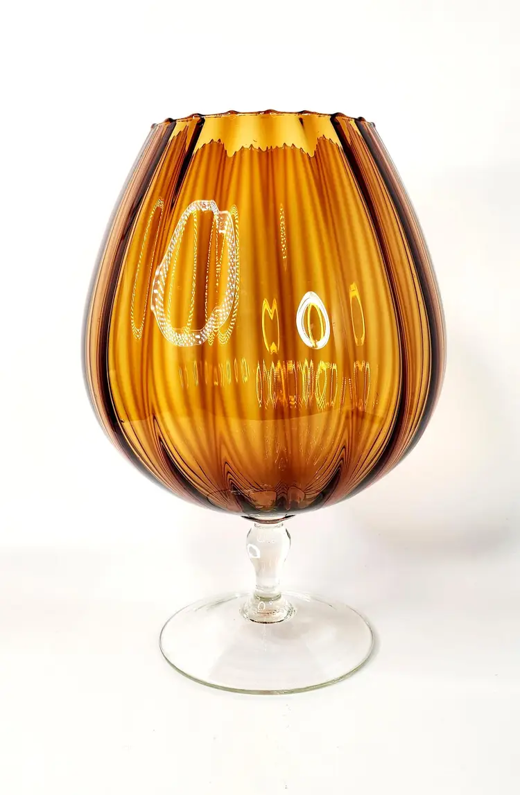 Vintage, 60's - Empoli Italy - Snifter Glass/Baloon Vase, amber glass with ribbed optical pattern, clear glass stem, handblown. Unmarked, used to have a long ribbon like paper label.