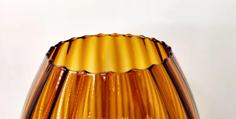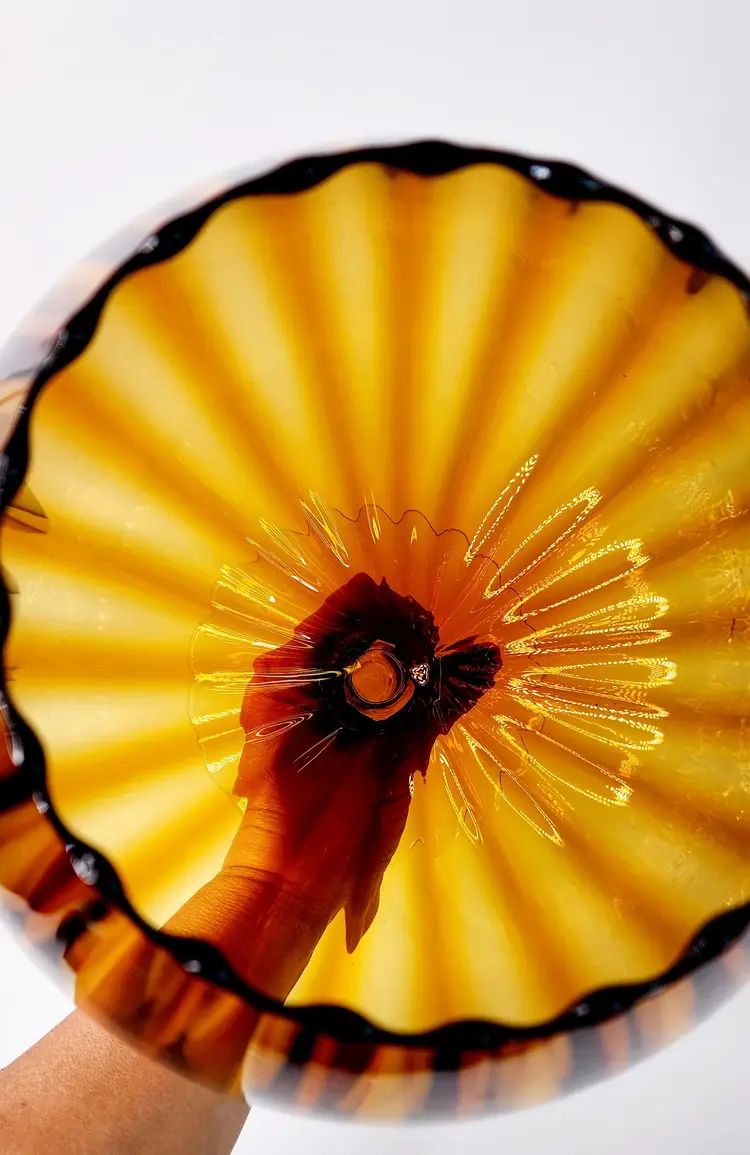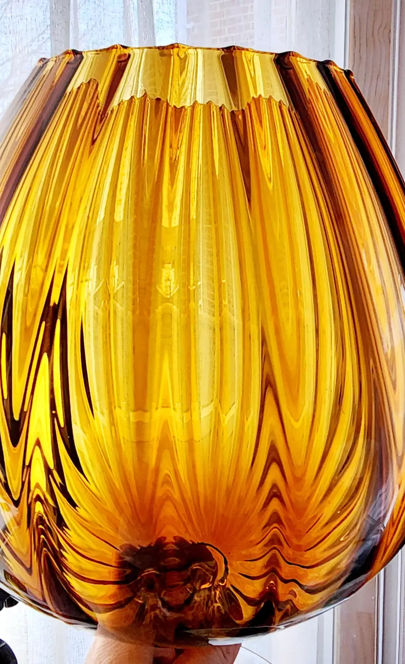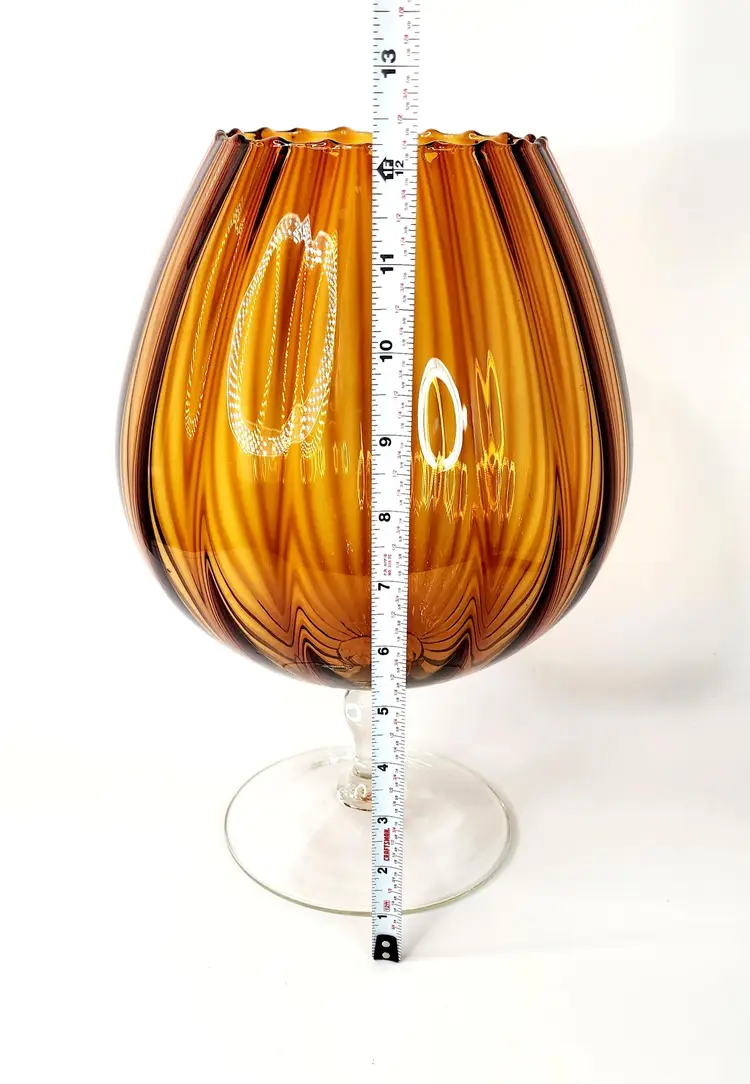Vintage, 60's - Empoli Italy - Snifter Glass/Baloon Vase, amber glass with ribbed optical pattern, clear glass stem, handblown. Unmarked, used to have a long ribbon like paper label.
