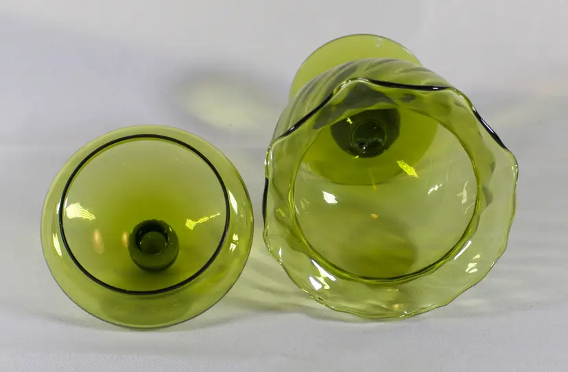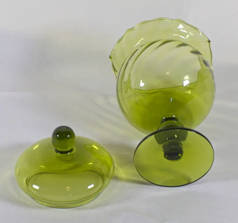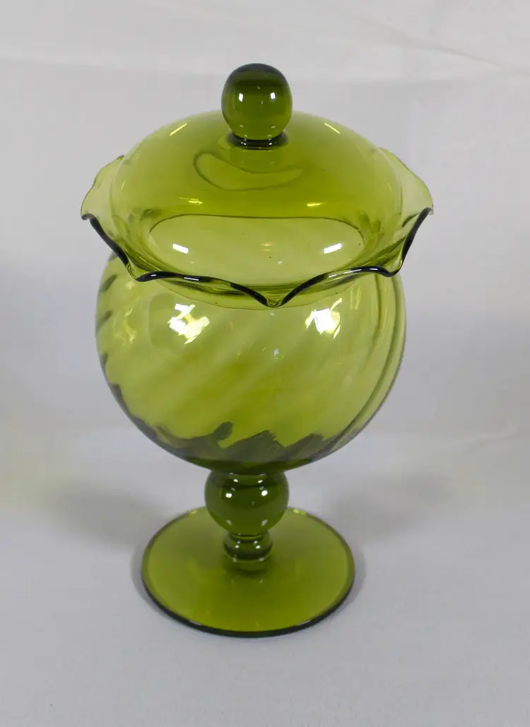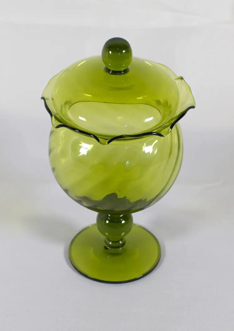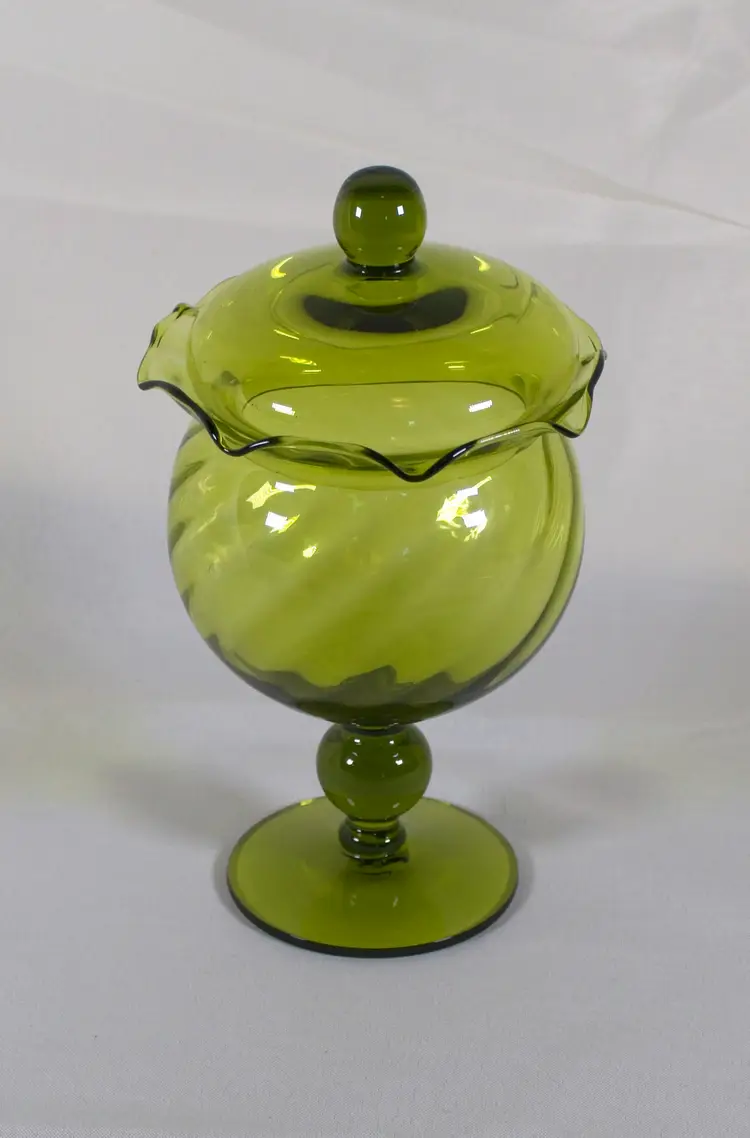 Vintage Empoli Italy Avocado Green Apothecary Jar Pedestal Candy Dish 8.5" Tall. In good condition. 5" diameter x 8.5" tall