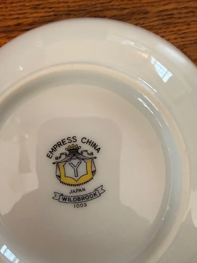 Details: Maker: Empress China Pattern: Wildbrook Origin: Japan Era: Late 1950s–1960s Size: Approximately 5.5 inches diameter Pattern / Shape Code: 1003
