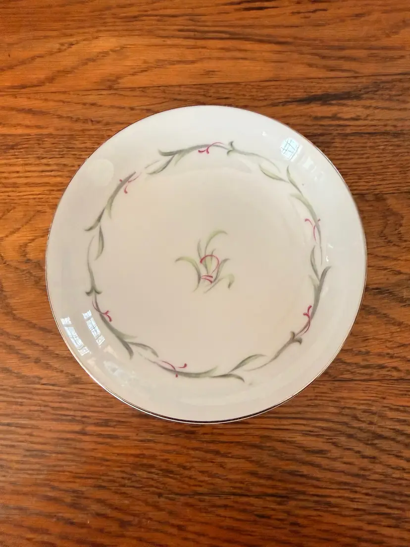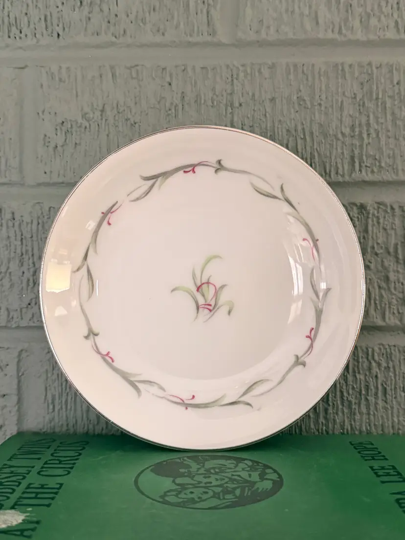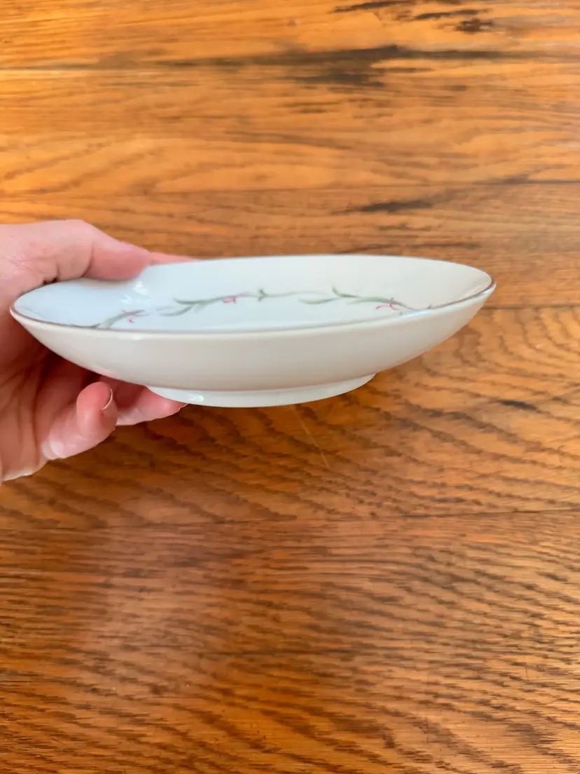 This lovely vintage Empress China “Wildbrook” shallow bowl features a soft ivory background with delicate green vine detailing and subtle pink accents, finished with a thin platinum rim. A classic mid-century Japanese design that works beautifully for cottagecore tables, everyday use, or as a replacement piece.