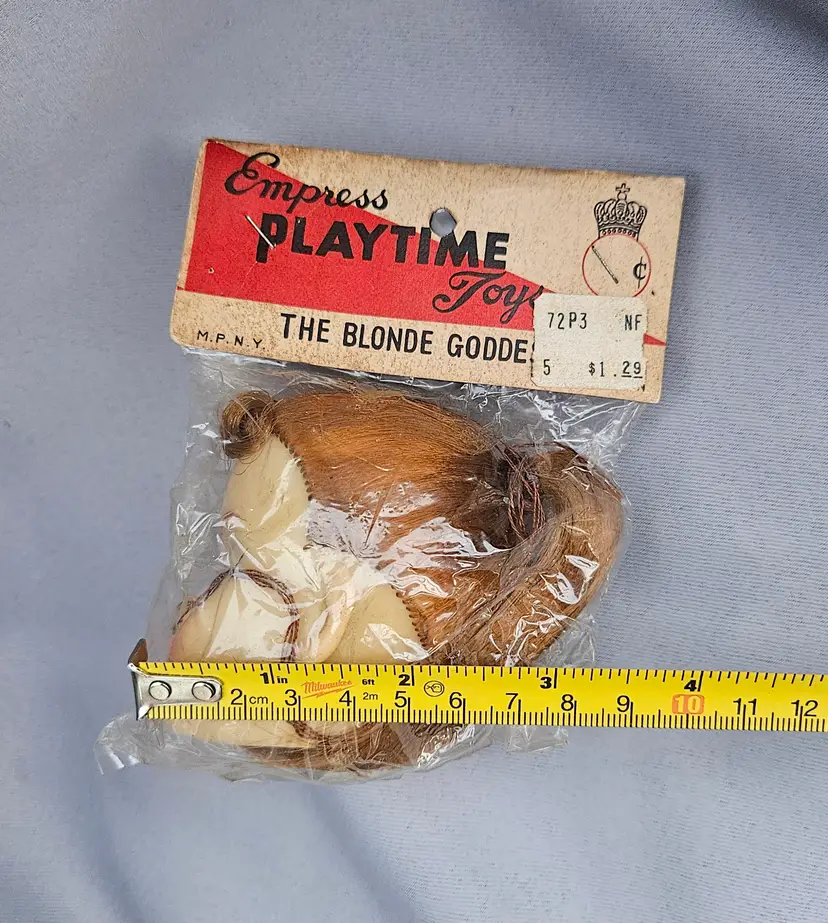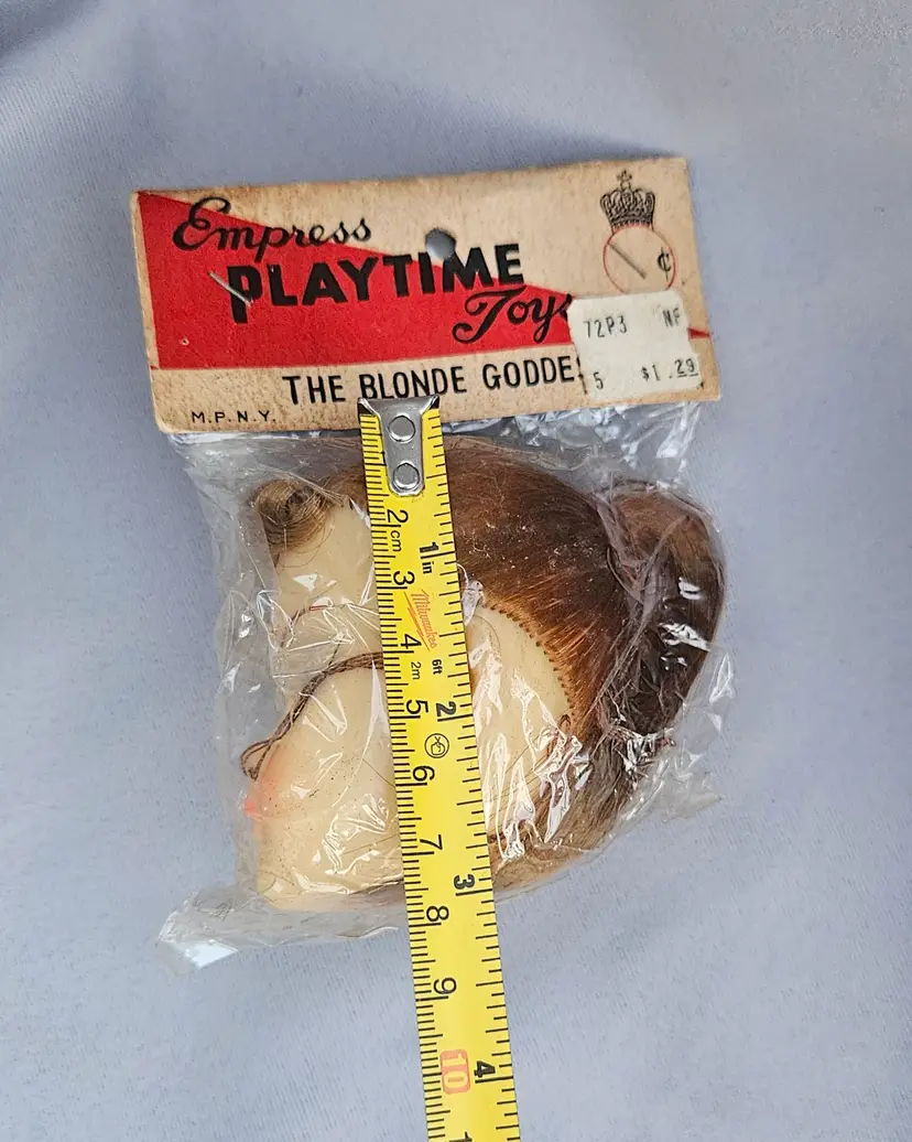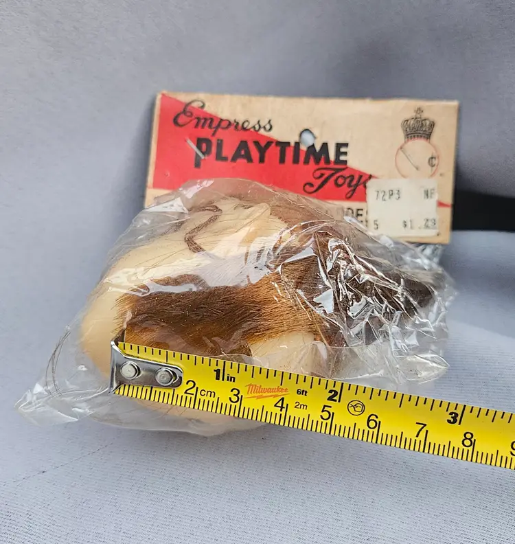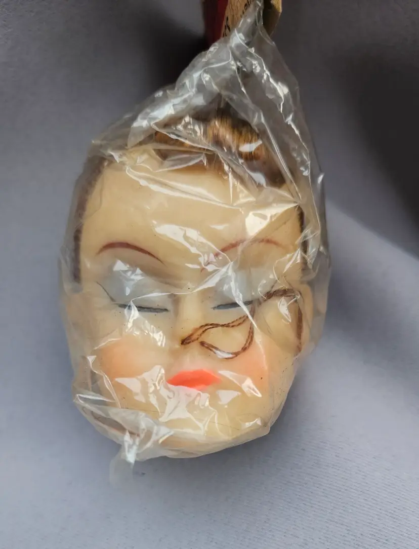 This vintage doll head is in its' original package, made in Japan. It is approximately 3" x 3" and the opening hole is approximately 1 1/4" wide.