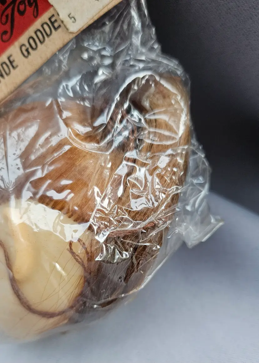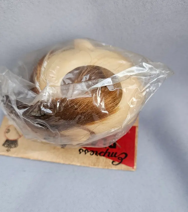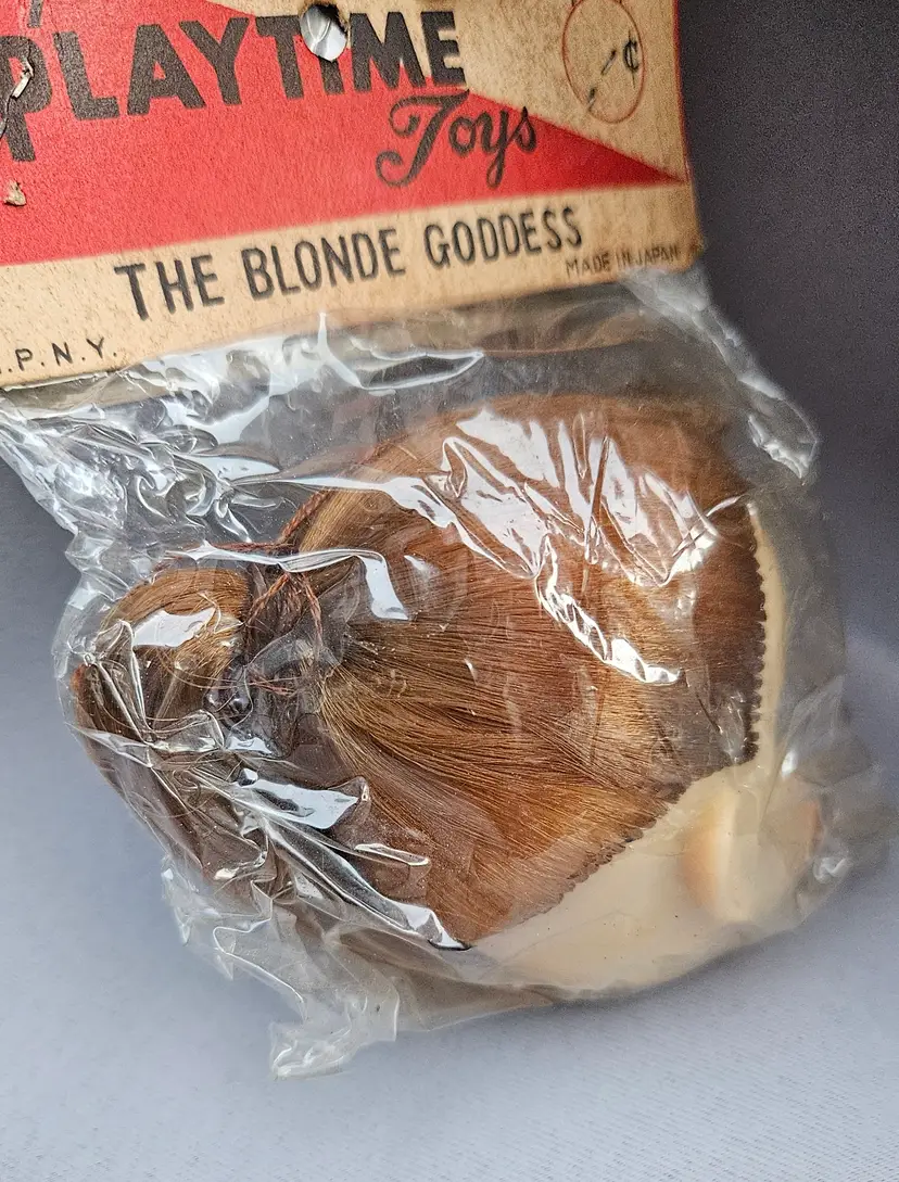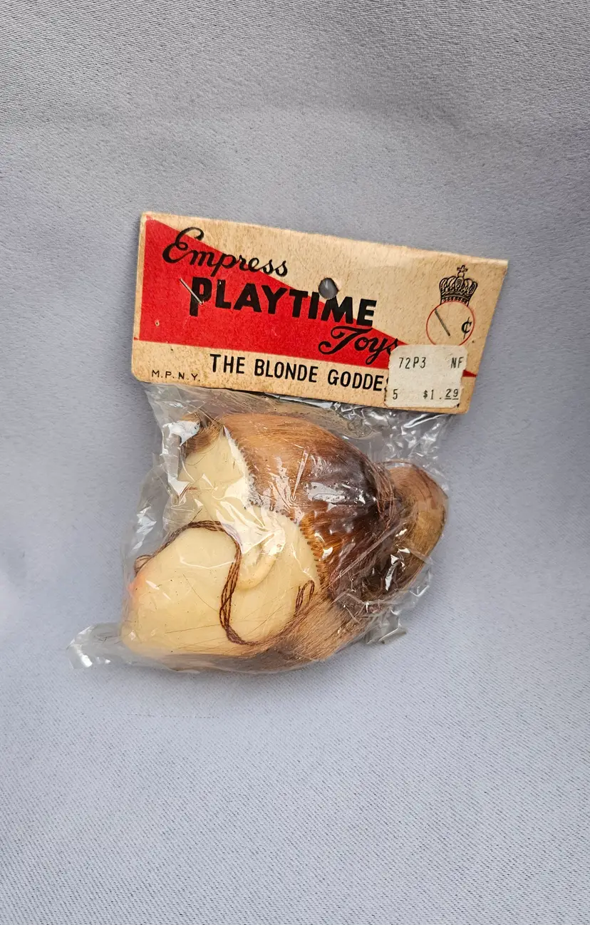 This vintage doll head is in its' original package, made in Japan. It is approximately 3" x 3" and the opening hole is approximately 1 1/4" wide.