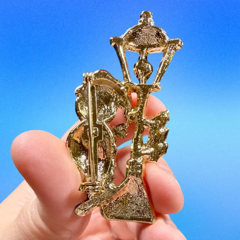 2.5”x1.25”. Gold tone enamel brooch with a fun little Christmas character standing at a light post. No makers mark. No issues!
