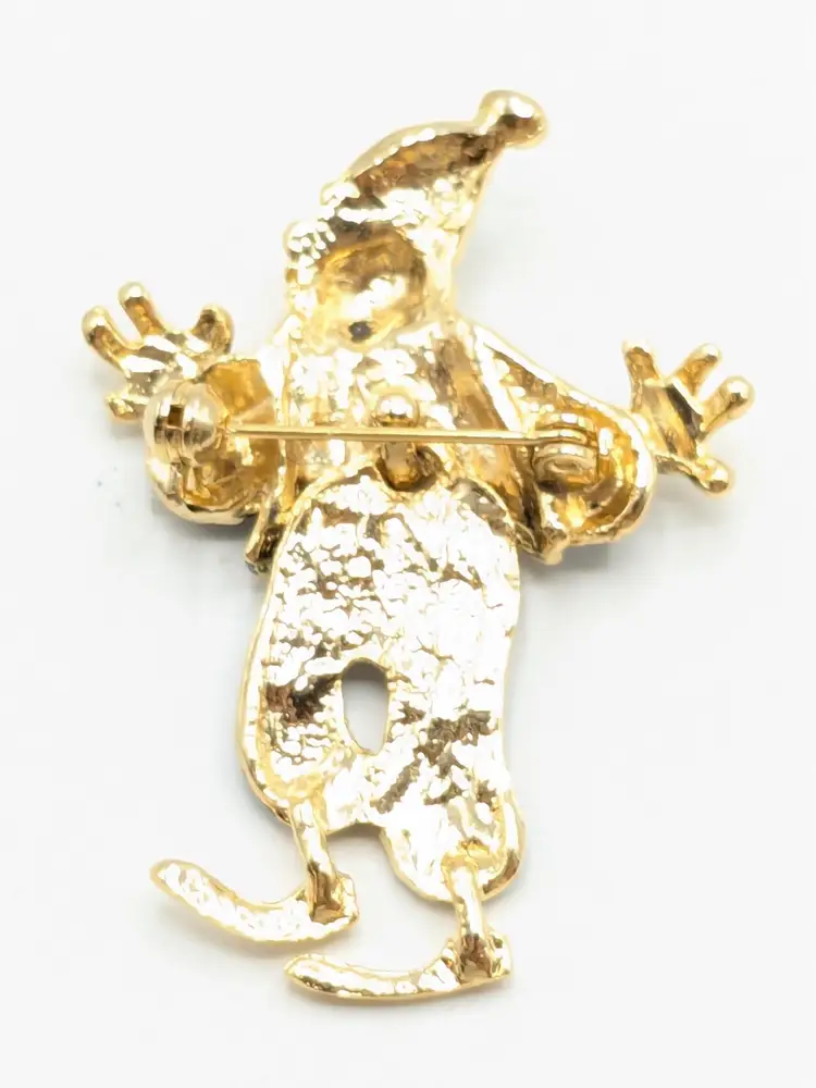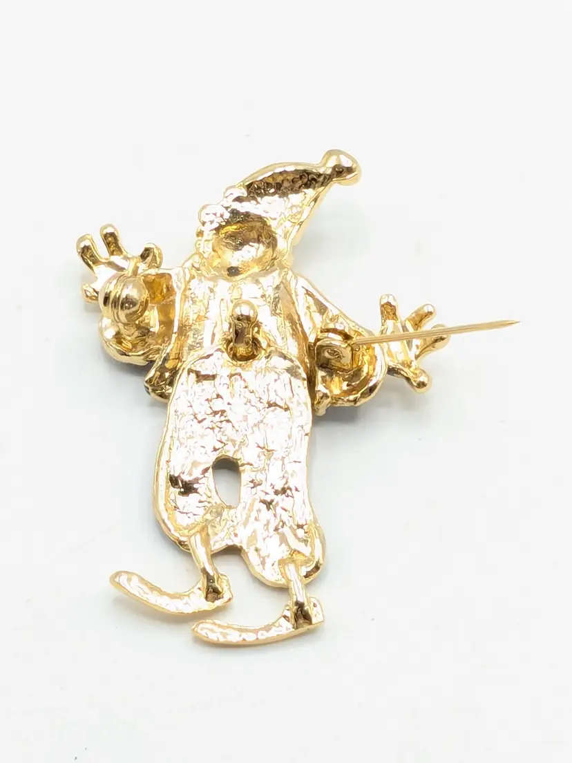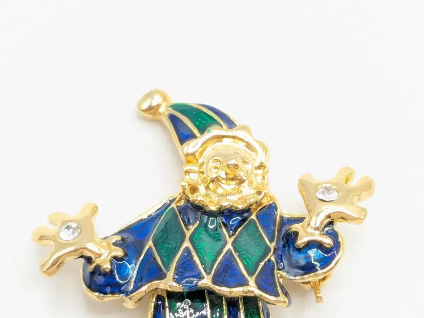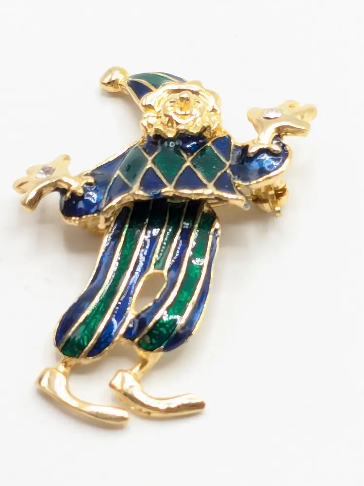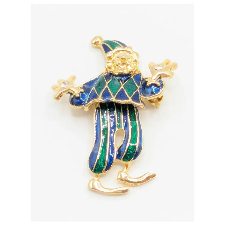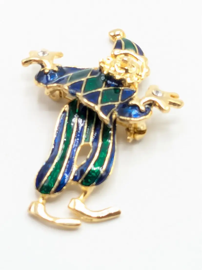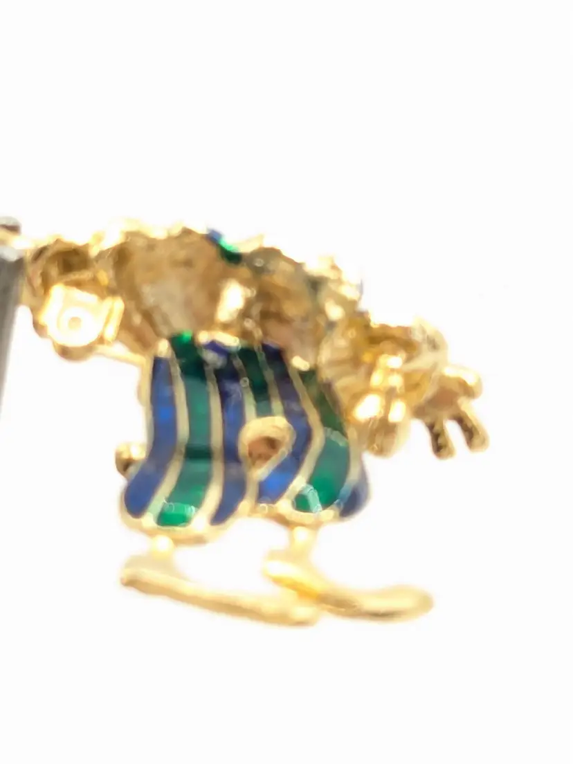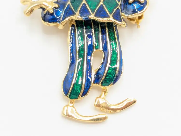 Good condition. Articulated as his legs move back and forth. Rhinestones. Features vibrant blue and green enamel with gold tone accents. Measures 2" height and 1 5/8" wide. (EN1)
