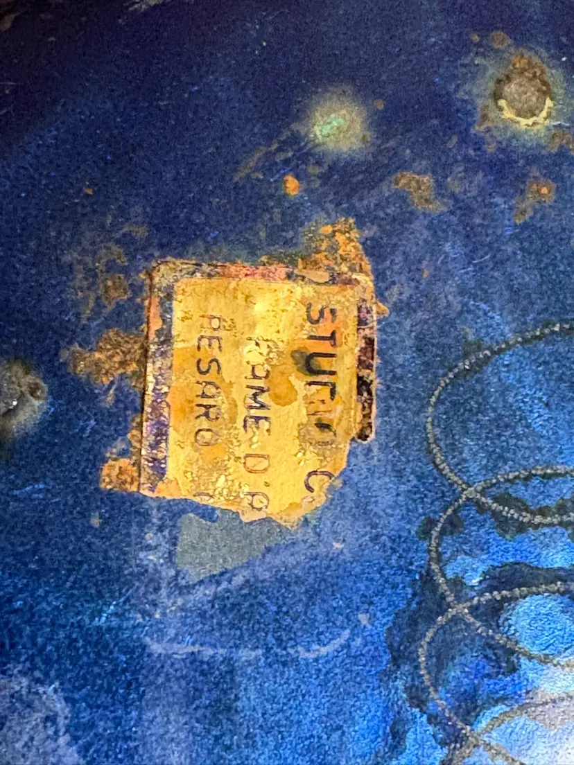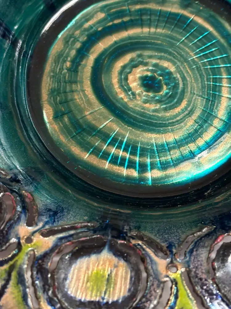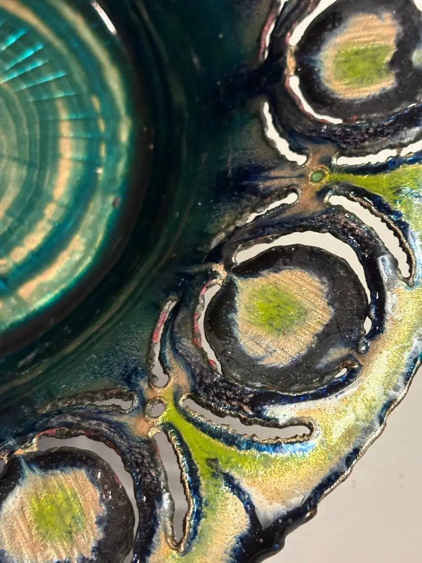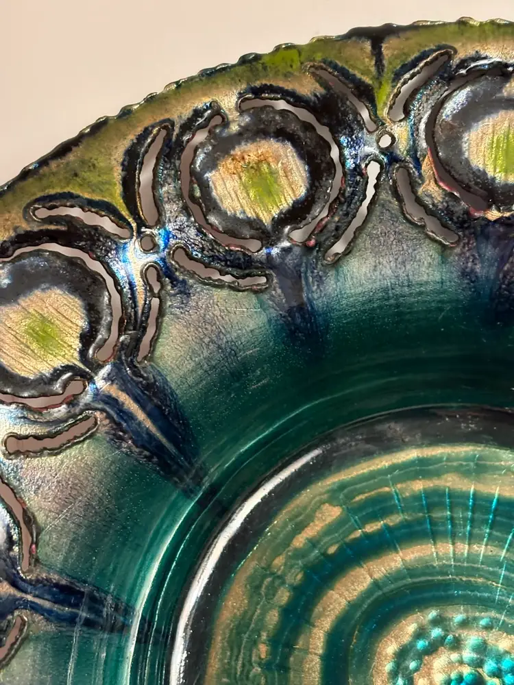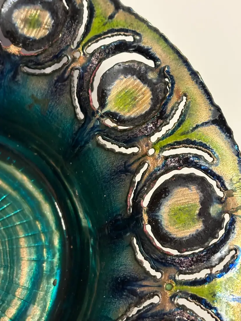 The product is a stylish and unique Copper Enameled Bowl by STUDIO C FAME D' PESARO. Made from high-quality copper, this bowl features intricate enameled designs that add a touch of elegance to any home decor. This bowl is a work of art with colors resembling a peacock. It’s versatile and practical addition to any collection of metalware. Its craftsmanship and timeless appeal make it a standout piece for collectors or those looking to enhance their living space with a touch of sophistication. 13” diameter and 3 1/2”’tall