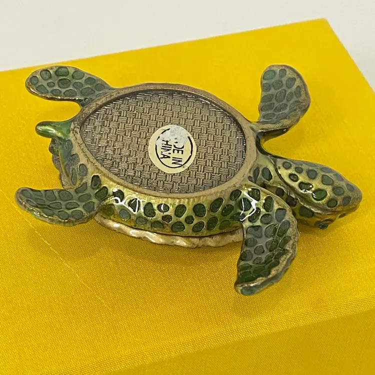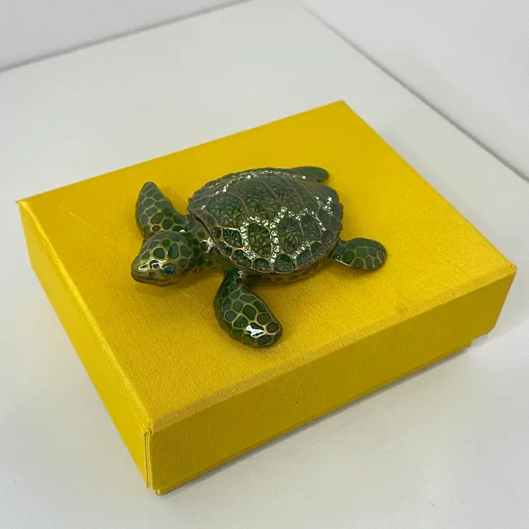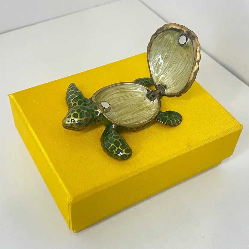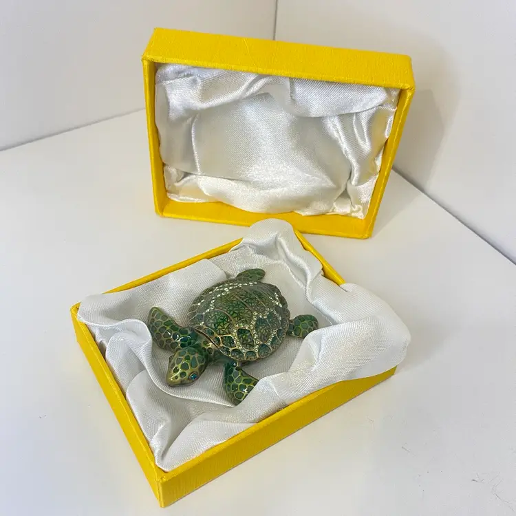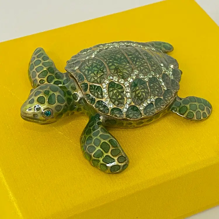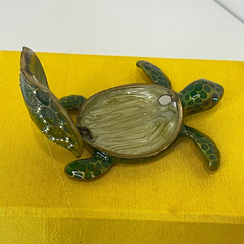 Vintage Enamel Rhinestone Dark Green Turtle Small Magnetic Keepsake Trinket Box. Very good vintage condition in original box. Please see pictures for details. SMOKE FREE/PET FREE HOME Approximate measurements: Length- 2.5" Width- 2.3" Height- .6"
