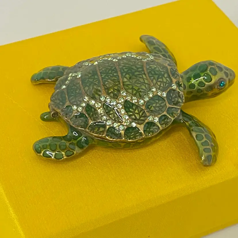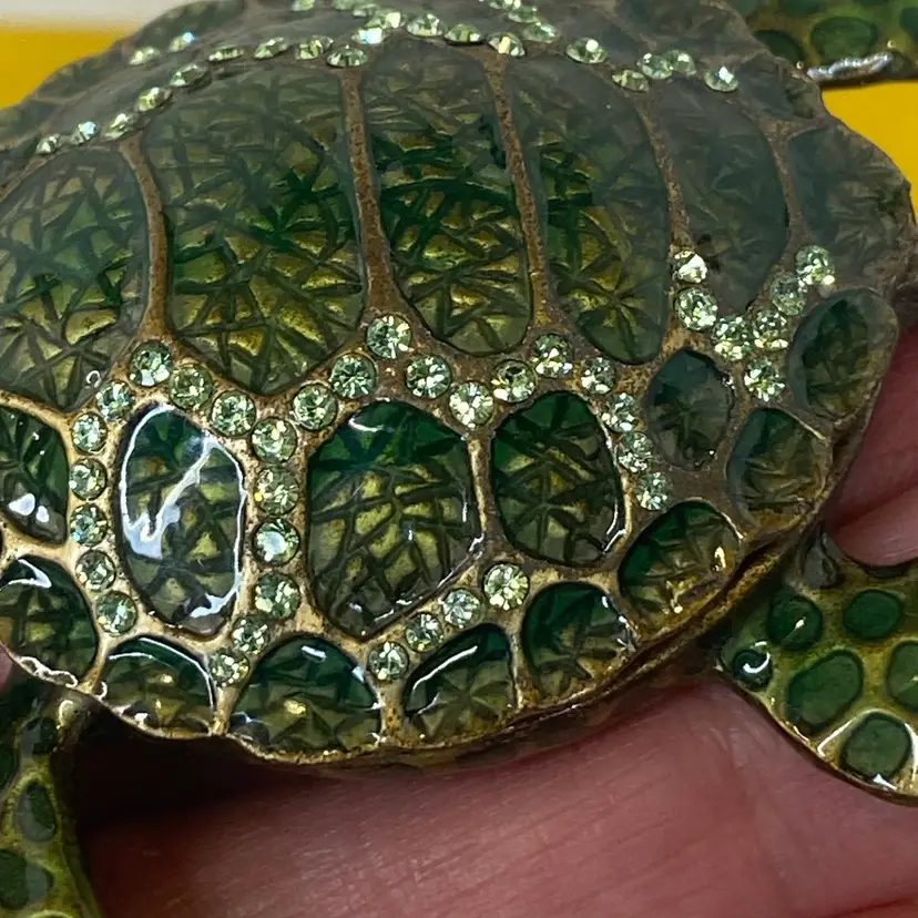 This is a vintage enamel trinket box in the shape of a small turtle. The dark green turtle is adorned with rhinestones and has a magnetic closure. It features a high gloss finish and textured design. Perfect for adding a touch of eclectic charm to any room.